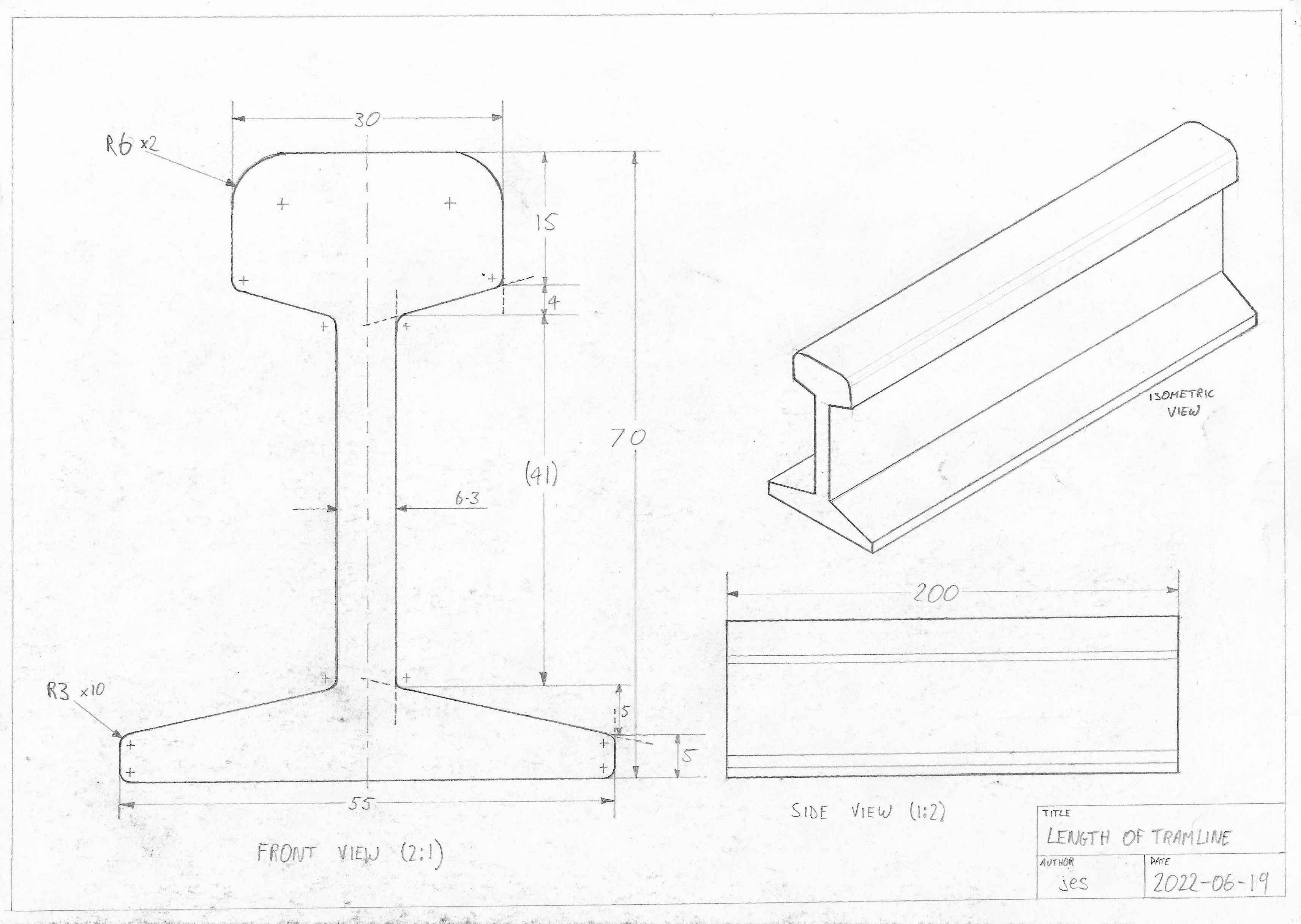 This is a drawing of a short length of tramline that I own. I found it interesting that most of the dimensions seem to be metric, except the thickness of the central web which is 1/4 of an inch.