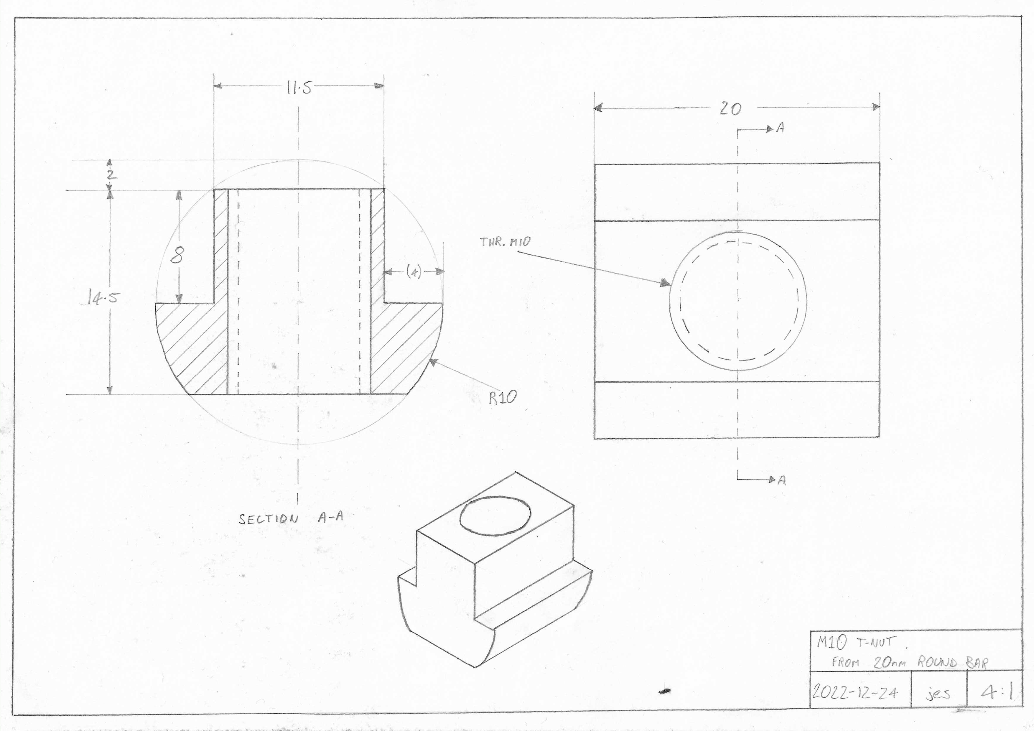 Similar to the other t-nut drawing, except this one is designed to be made from 20mm round bar, because I have plenty handy. Perhaps M10 is a bit too big, maybe M8 or M6 would be a better choice.