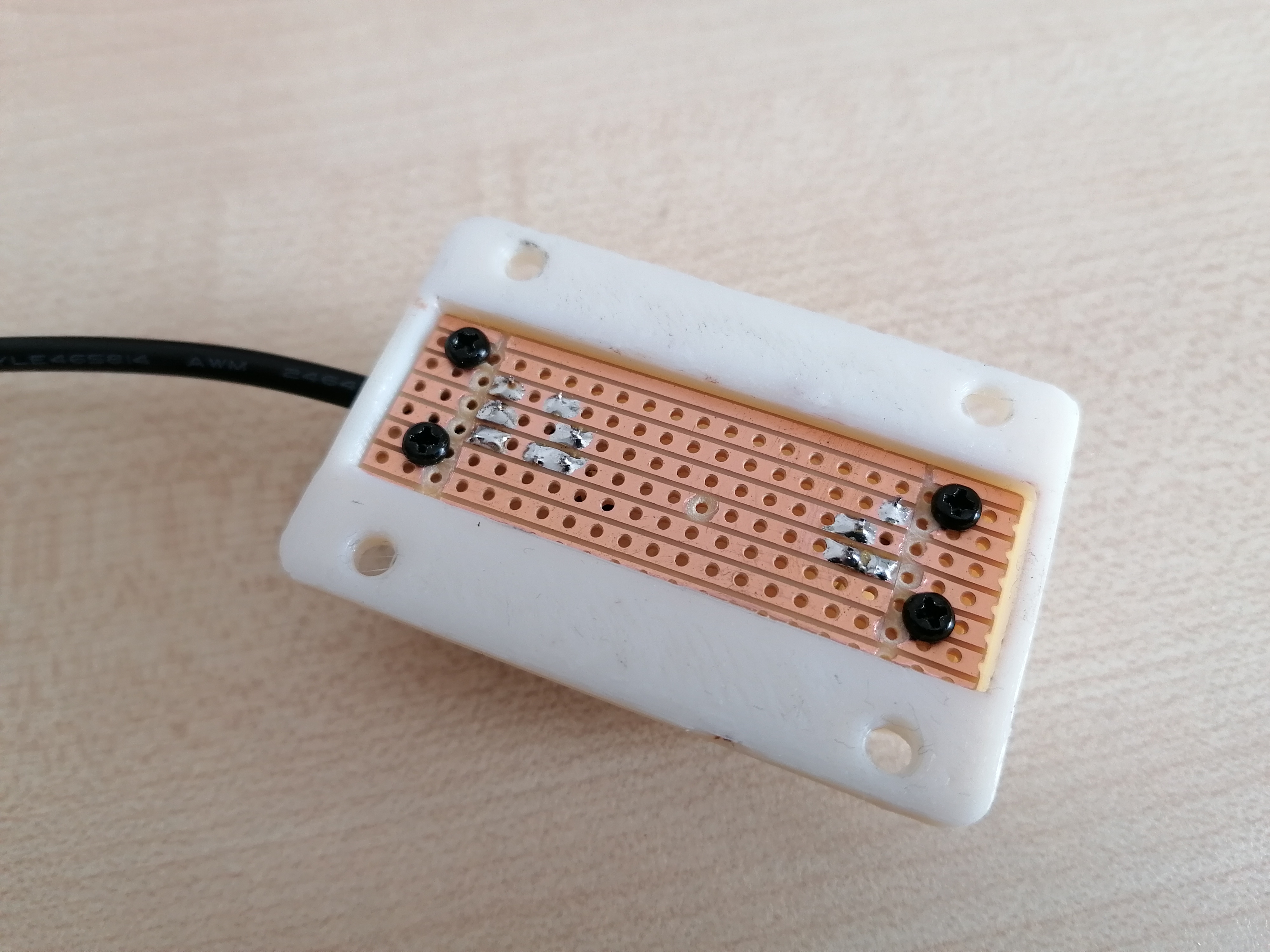 It's just an infrared LED and infrared photodiode facing each other, and a couple of resistors, on a piece of stripboard, inside a 3d-printed housing. The slotted disc will run in the gap between the LED and the photodiode so that it intermittently blocks the light path, which allows me to count the pulses to work out the angle the crank has rotated at any given time.