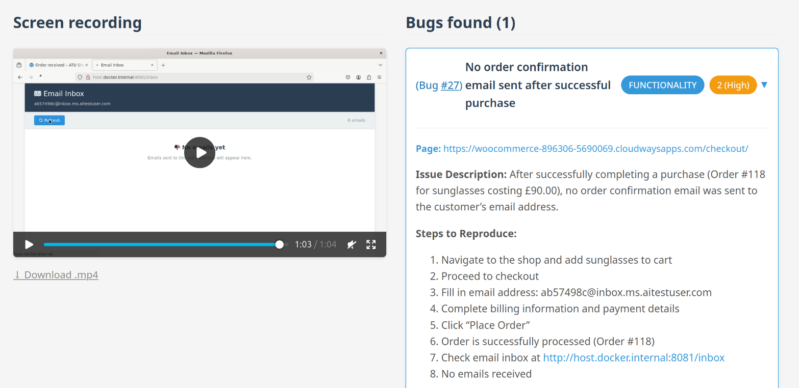 For a more realistic example run, you could see this report for an example shop. It goes through a WooCommerce shop, finds the product we asked it to buy, checks it out using the Stripe dummy card number, and then checks that it received the confirmation email. It reported a bug on that one because it didn't get the confirmation email.