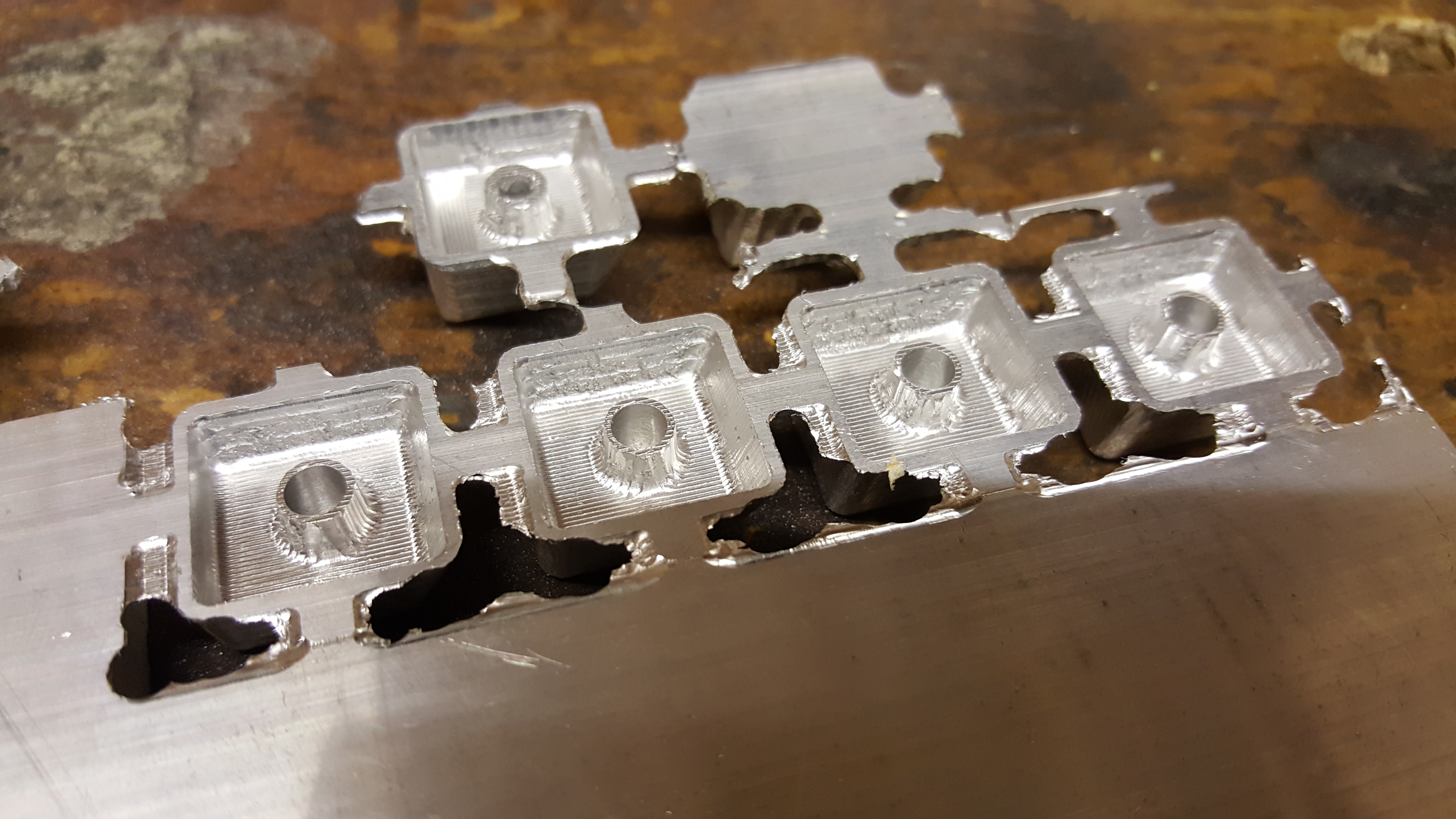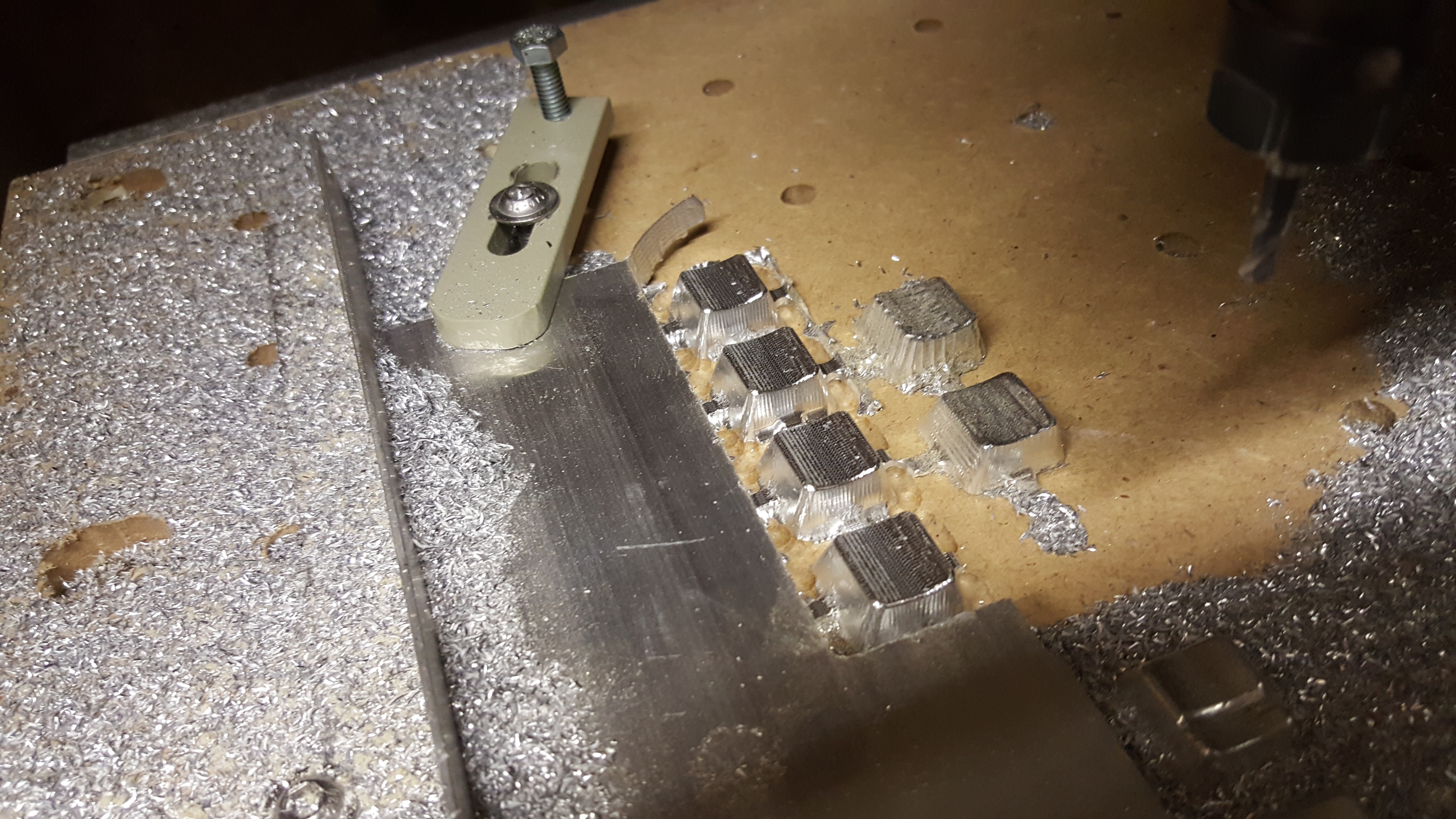 The problem comes when you need to flip the part over to machine the bottom side. In total I had 12 attempts at making keycaps, and only for the final 4 (machined as a single batch) did I manage to successfully align the bottom side with the top side. You can see some of the failed attempts still attached to the base material, from where I was too demoralised to even bother separating them.