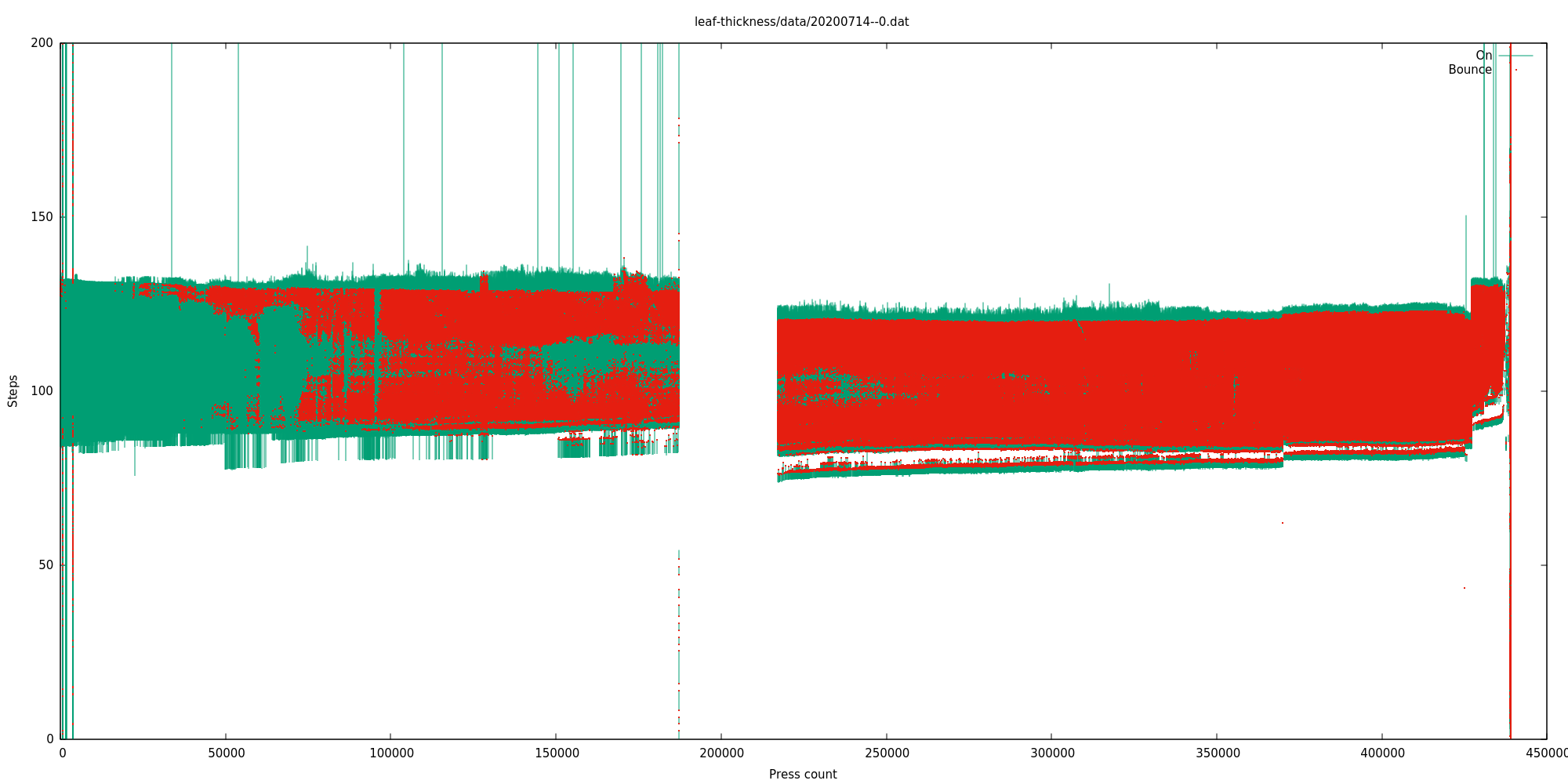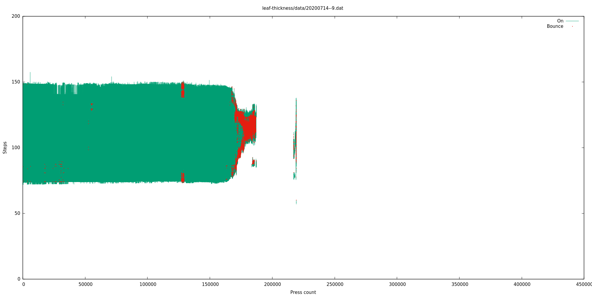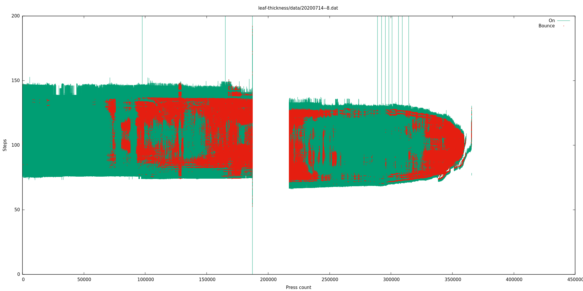 The gap between 180,000 and 210,000 is where the motor had stalled but the software didn't know (for this reason I subtracted 30,000 from the press count of every switch that exceeded 180,000). I expect it stalled because the broken leaf spring from one of the failed switches got wedged and made it harder for the platform to move up and down. Don't know.