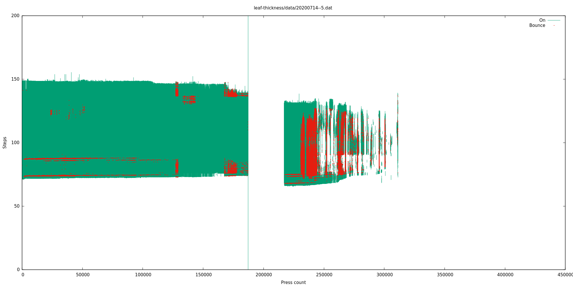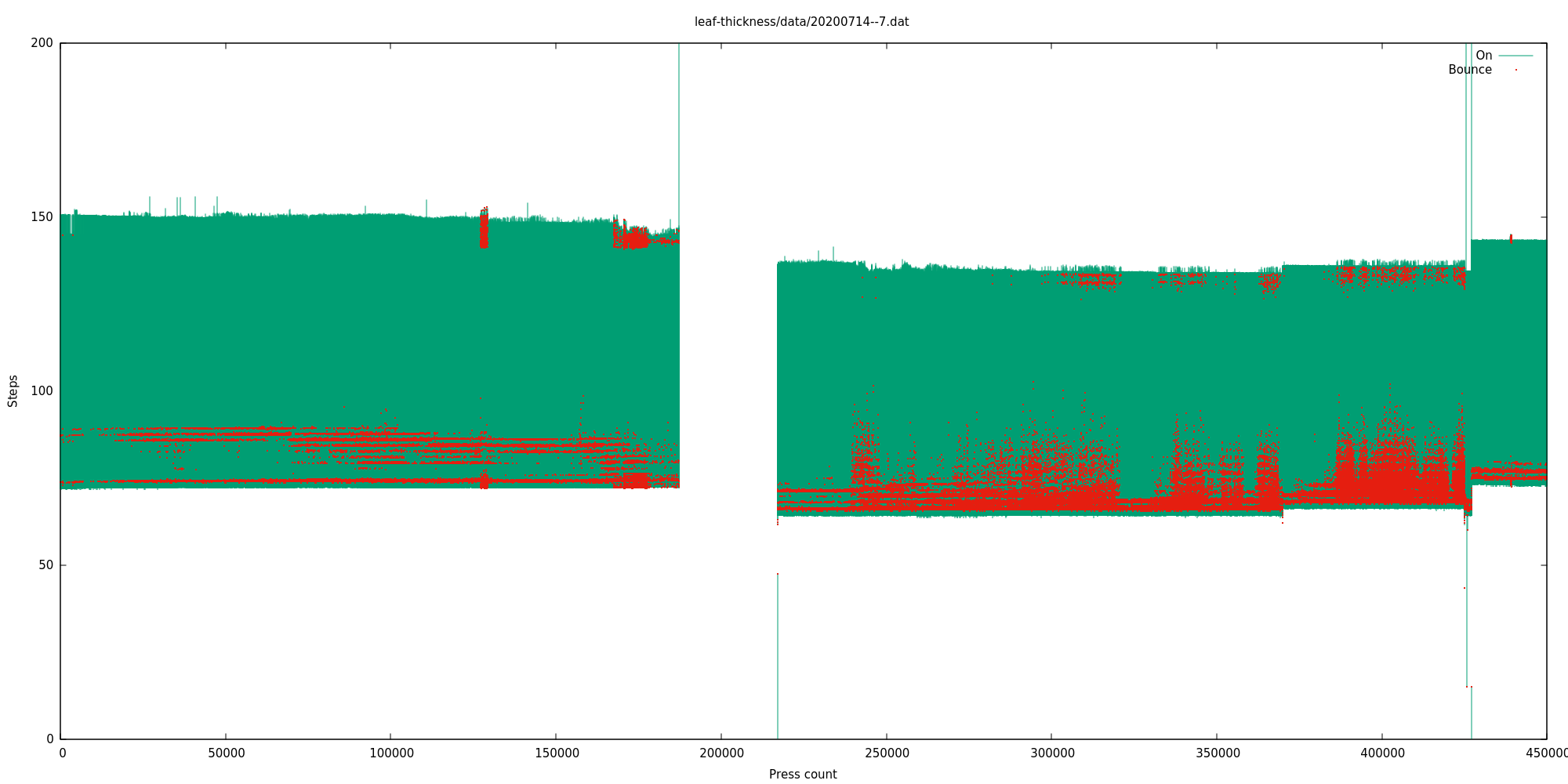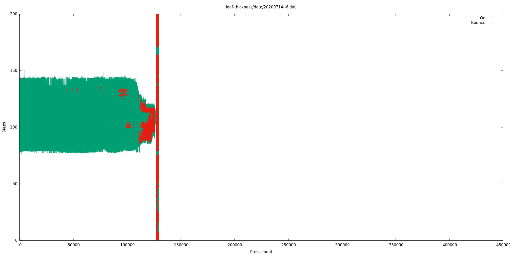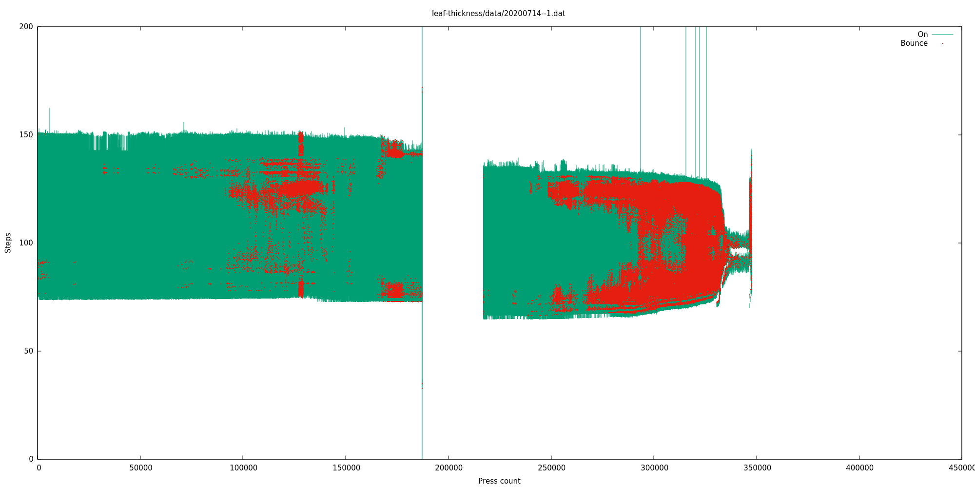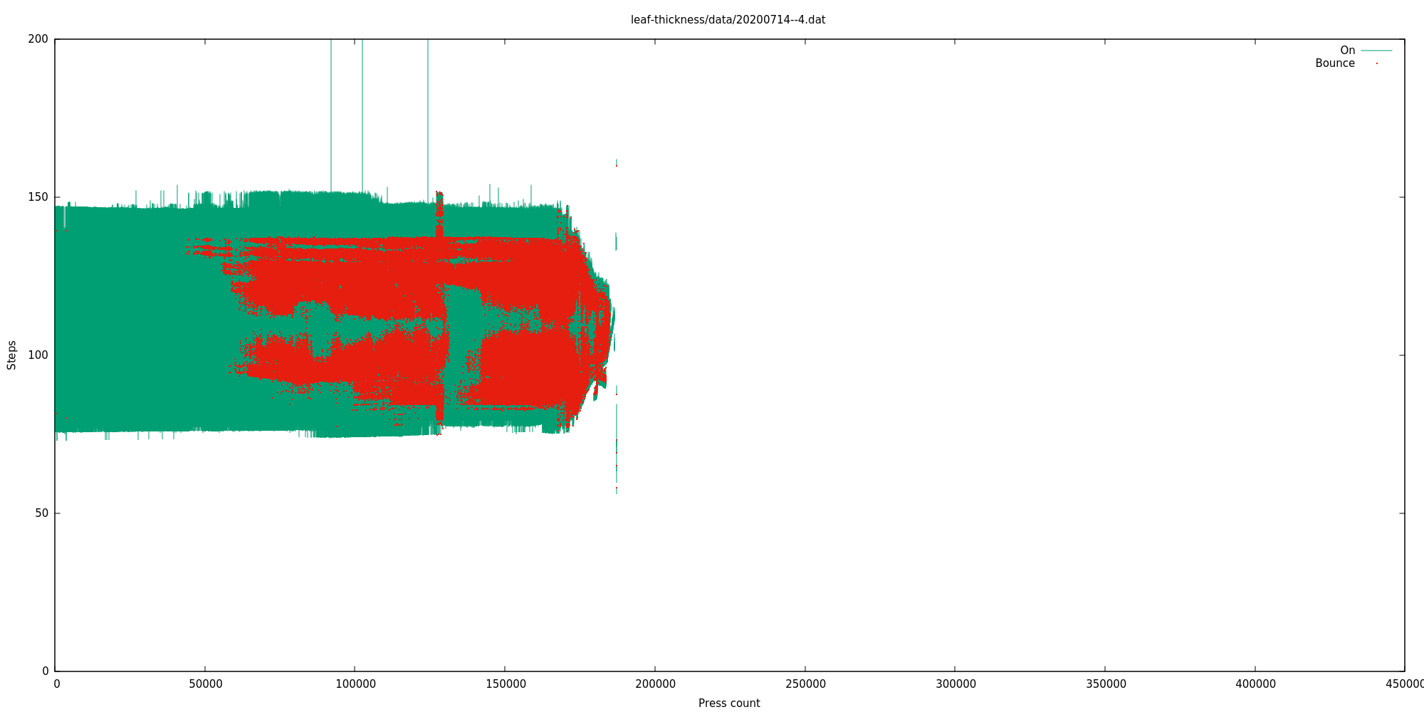 But given that this switch still appears to work completely fine, we know that we can have at least this much bounciness (red) and not consider it a problem. For this reason I mostly ignored bounce information and classified a switch as "failed" only after it had either clearly stopped working entirely, or its activation range had become unpredictable or very small. Typically the switch gets bouncier over a long period but still works fine, and then its activation range degrades over quite a short period, and then the leaf spring breaks off and it either stops working entirely, or comes on and off unpredictably due to the machine vibration, if the leaf spring fell off in a way that can still short the contacts.