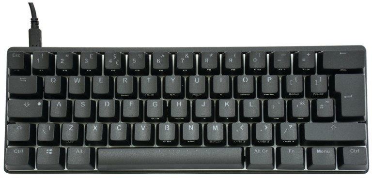 I intend to use an Arduino Pro Micro for the microcontroller. The Pro Micro has 16 available IO pins, which means the largest keyboard matrix we can use is 8x8 or 64 keys. This precludes using the Tenkeyless layout which I use at the moment, or even the TADA68 layout which the SiCK-68 uses, but does allow a 60% layout, like this: