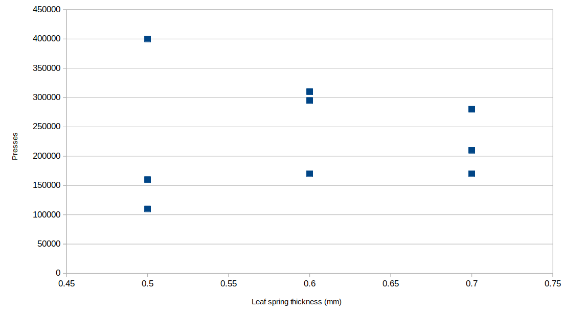 If we say switch 0 is an outlier and ignore it, then what remains could look something more like a bell curve with a peak around 0.6 mm. So I'll probably stick with 0.6 mm leaf springs.