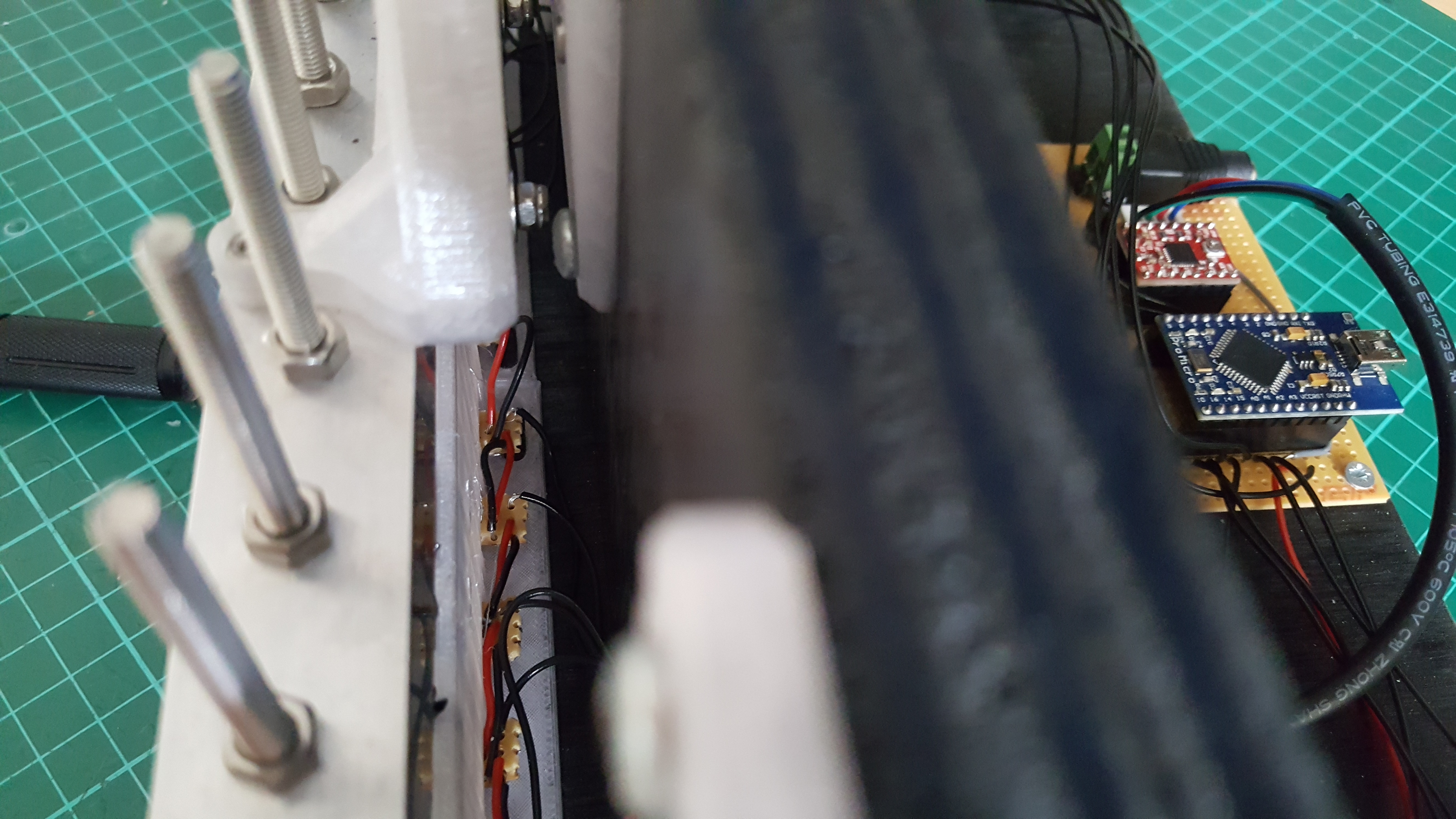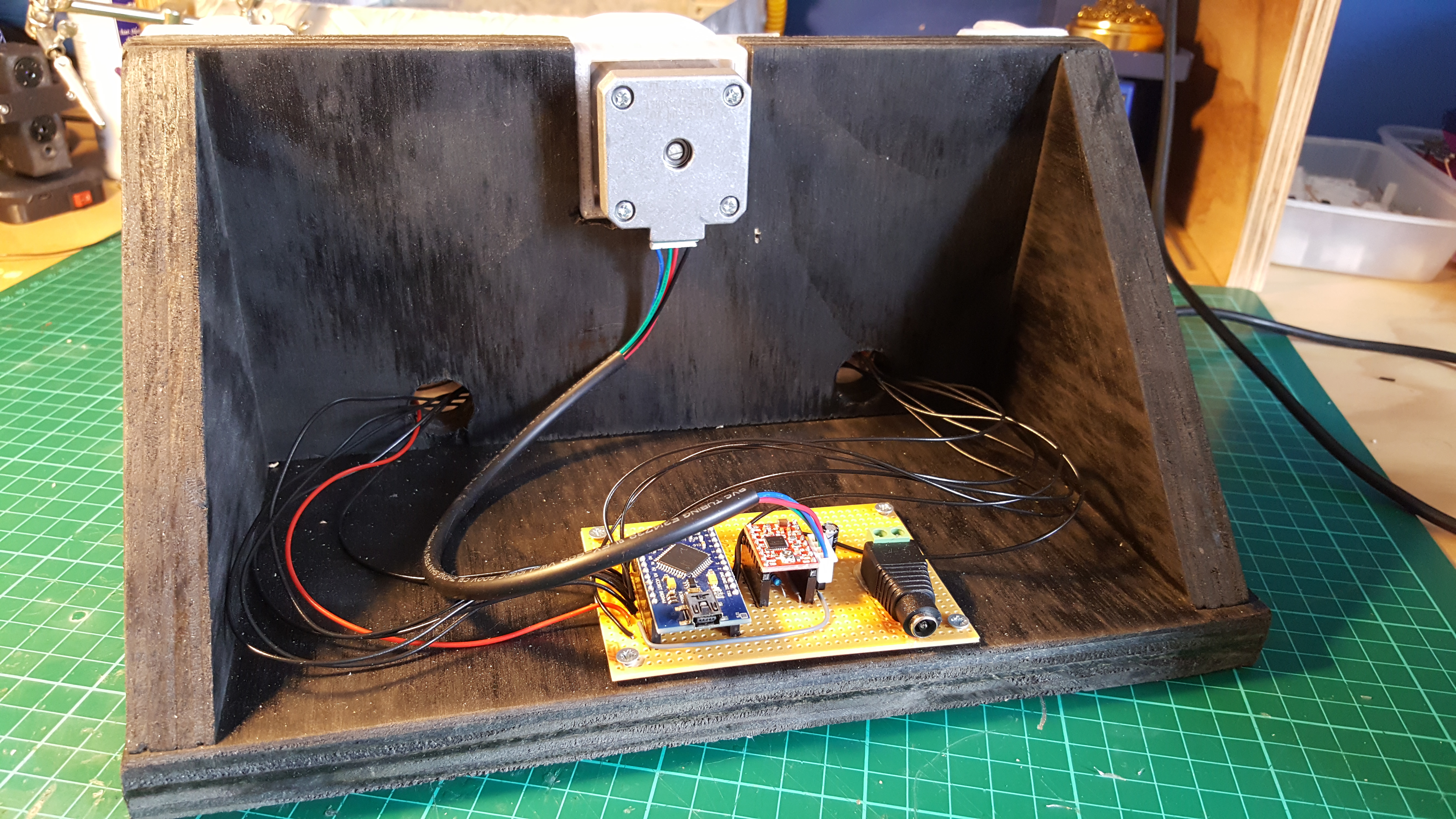 To avoid the mess of jumper wires running everywhere like on the previous tester, I put the Arduino, stepper driver, and DC barrel jack on a piece of stripboard:
