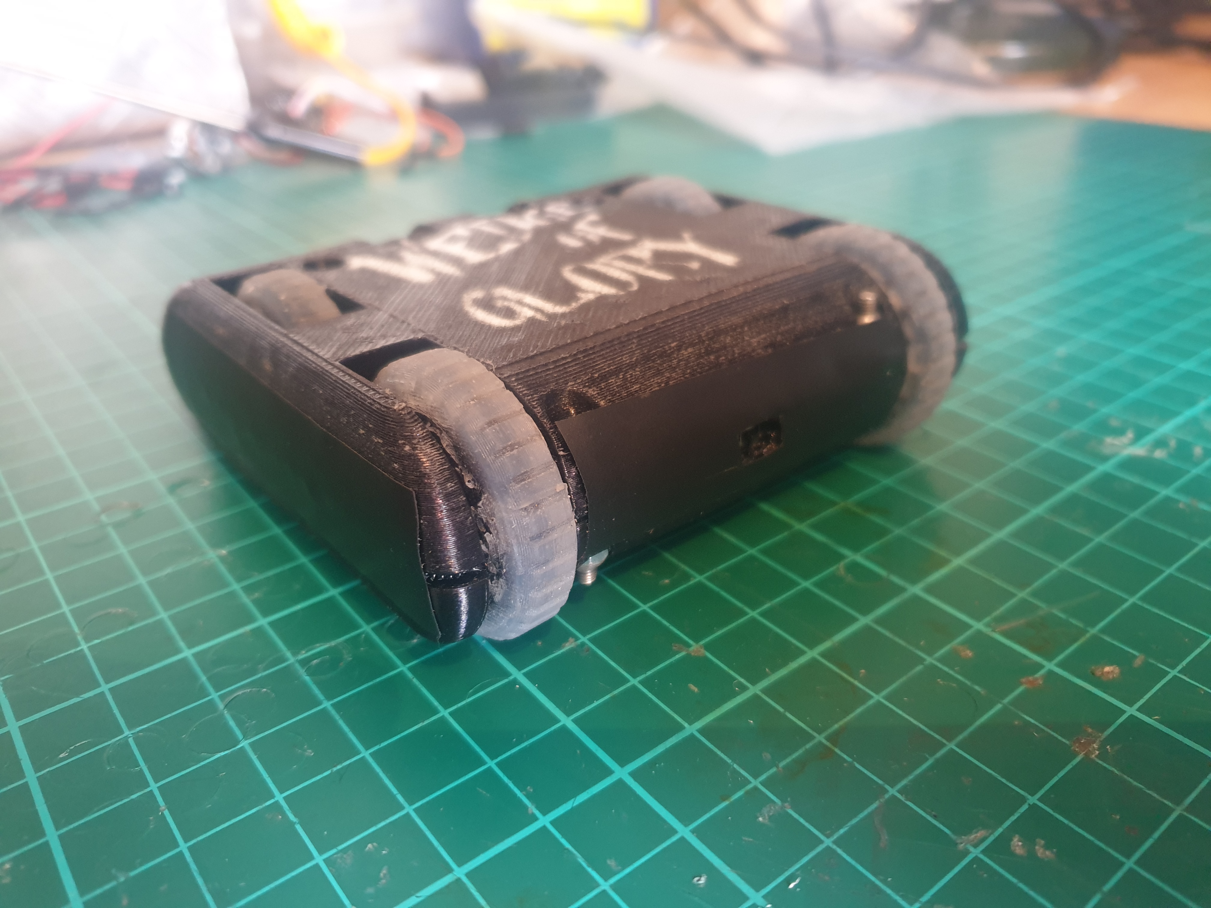 I would have liked to have had a 1-on-1 fight against a spinner, as I still don't know what would happen. Most of Wedge of Glory is printed with quite low infill and only 1 perimeter in order to save on weight, so it's quite possible that a spinning weapon would easily pierce it.
