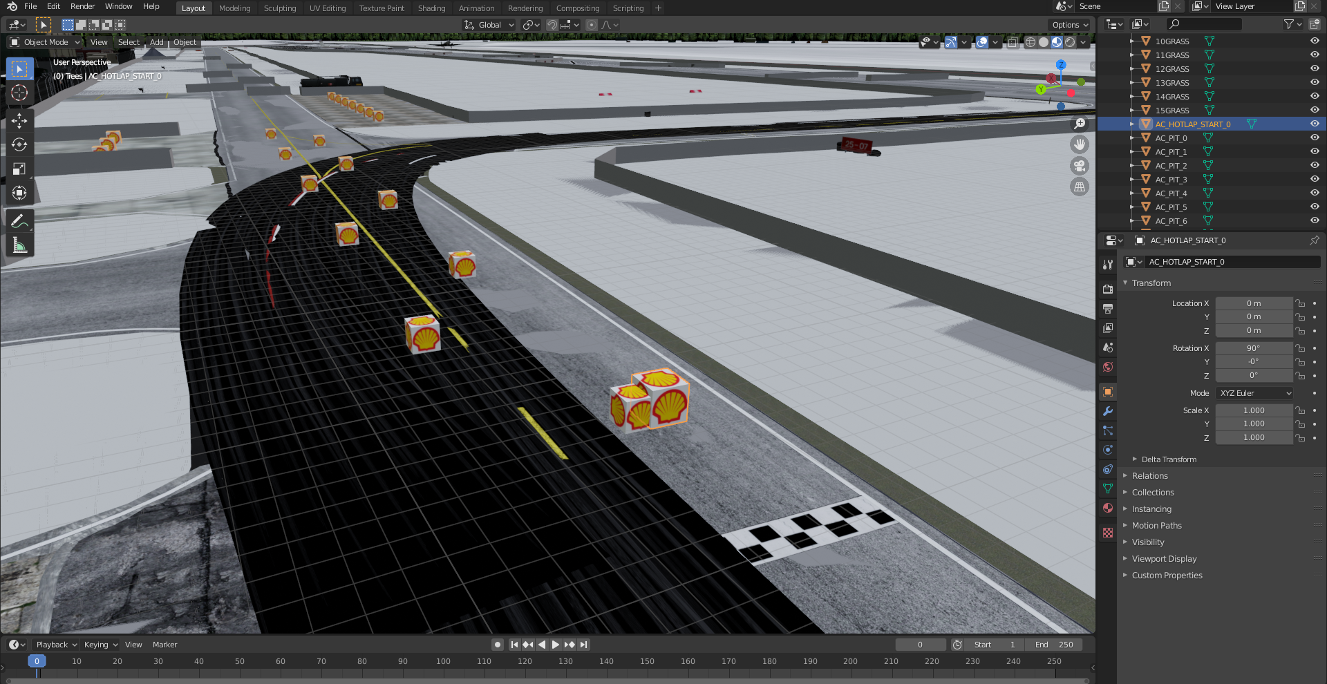 These have their purpose in Assetto Corsa for spawn points and timing checkpoints, but I would delete them here in Blender and later on use Godot's mesh to make them if lap time and different spawn points are needed.