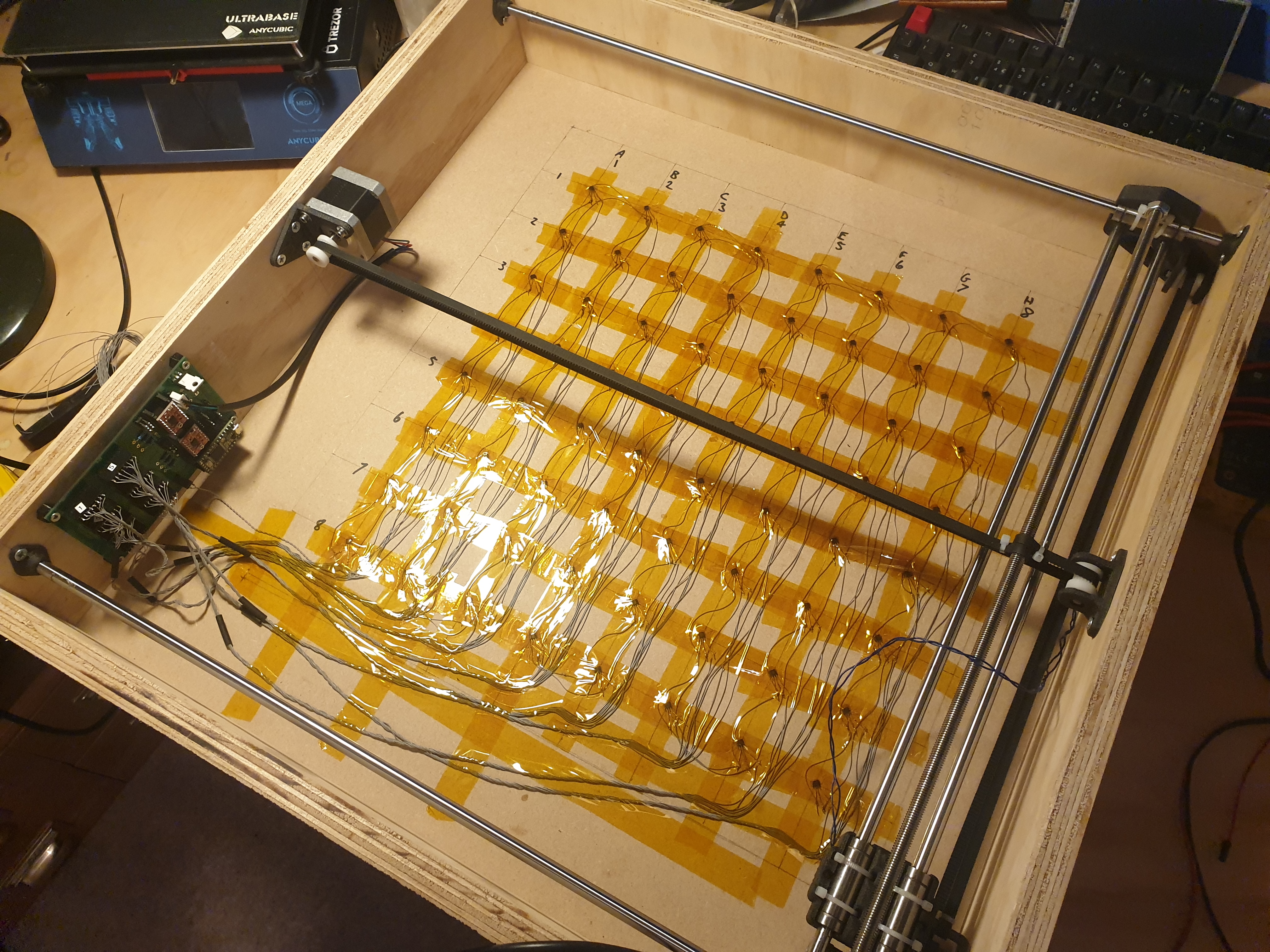 To actuate output moves, the board has X and Y axis motion stages, driven by NEMA17 stepper motors with GT2 timing belts, with an electromagnet mounted on the carriage. It's basically like a 3d printer but with no Z axis, and with an electromagnet instead of a hot-end. To detect input moves, the board has a hall-effect sensor underneath each square.