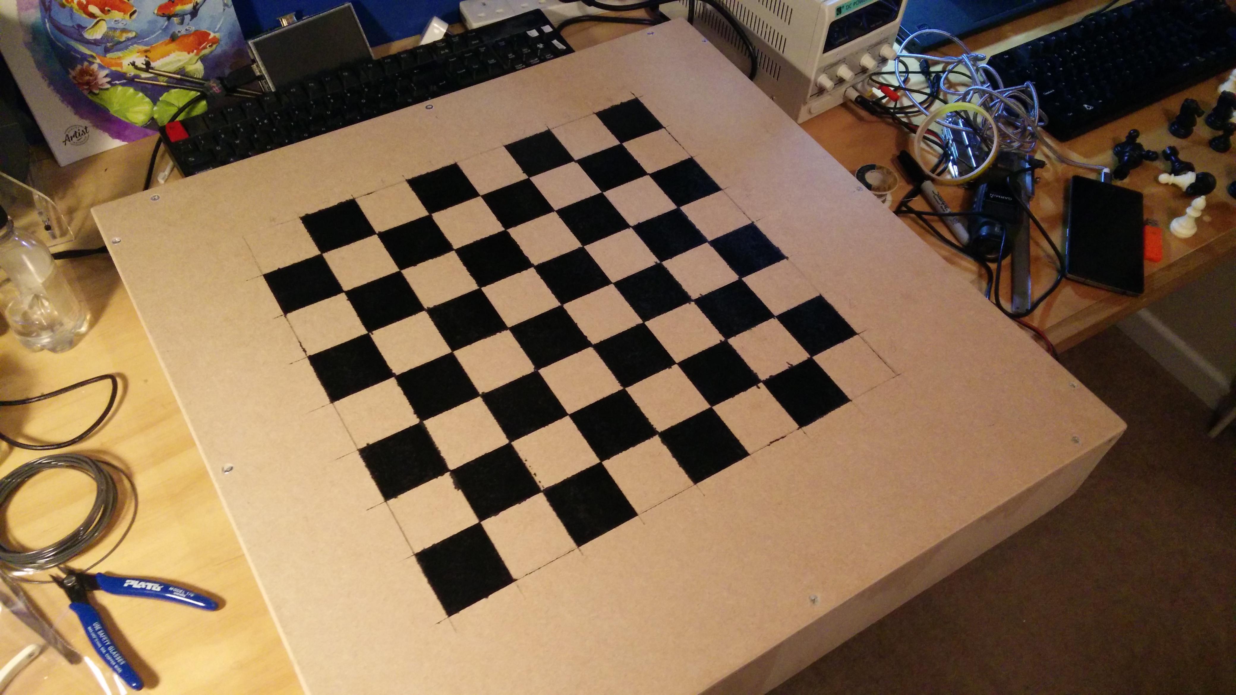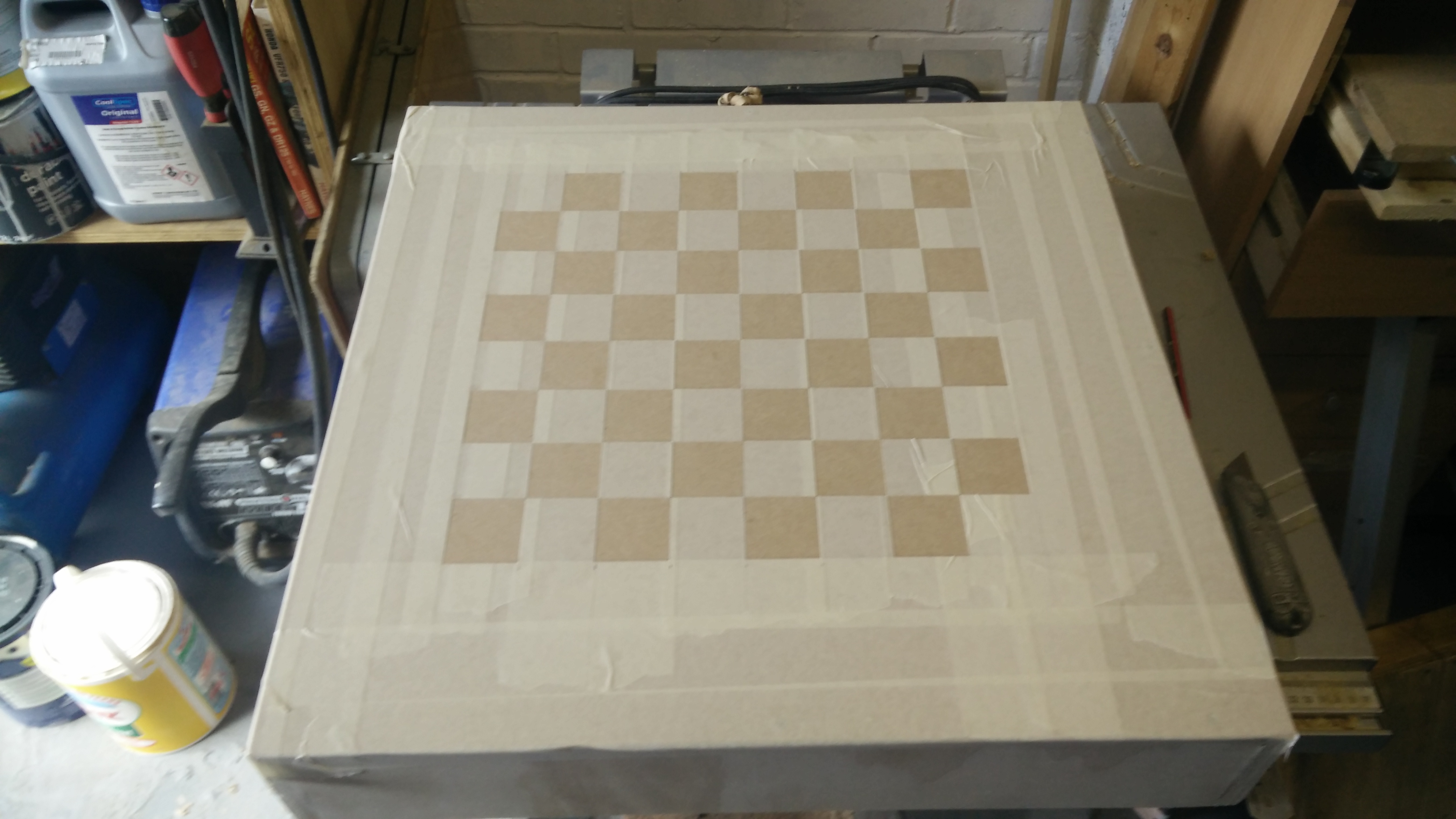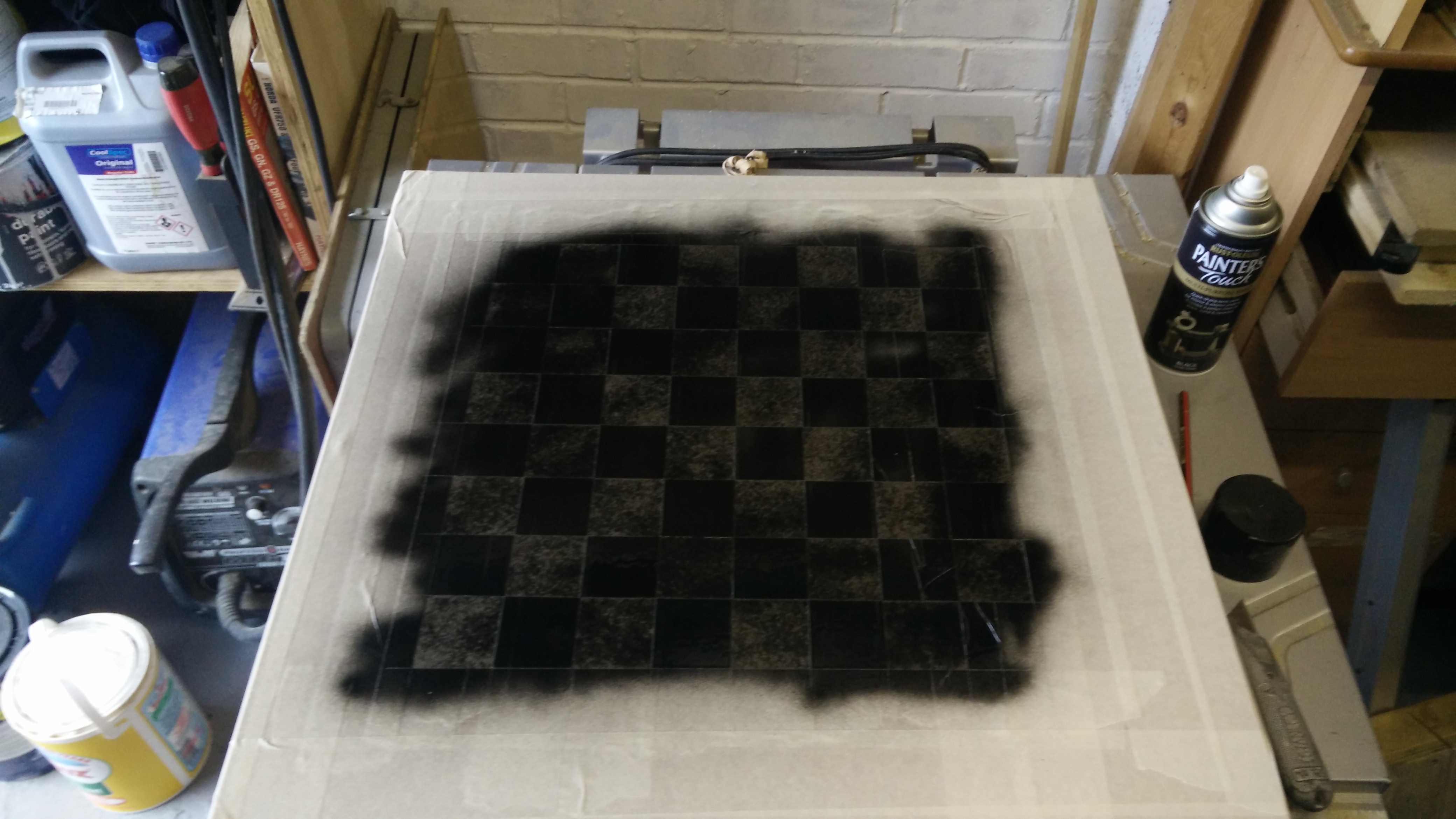 I don't think this worked spectacularly well, quite a lot of paint seems to have seeped under the tape and messed up adjacent squares. It's adequate though. After this, I sprayed several coats of lacquer over the top of the board to make it look nicer, and to reduce friction for moving the pieces.