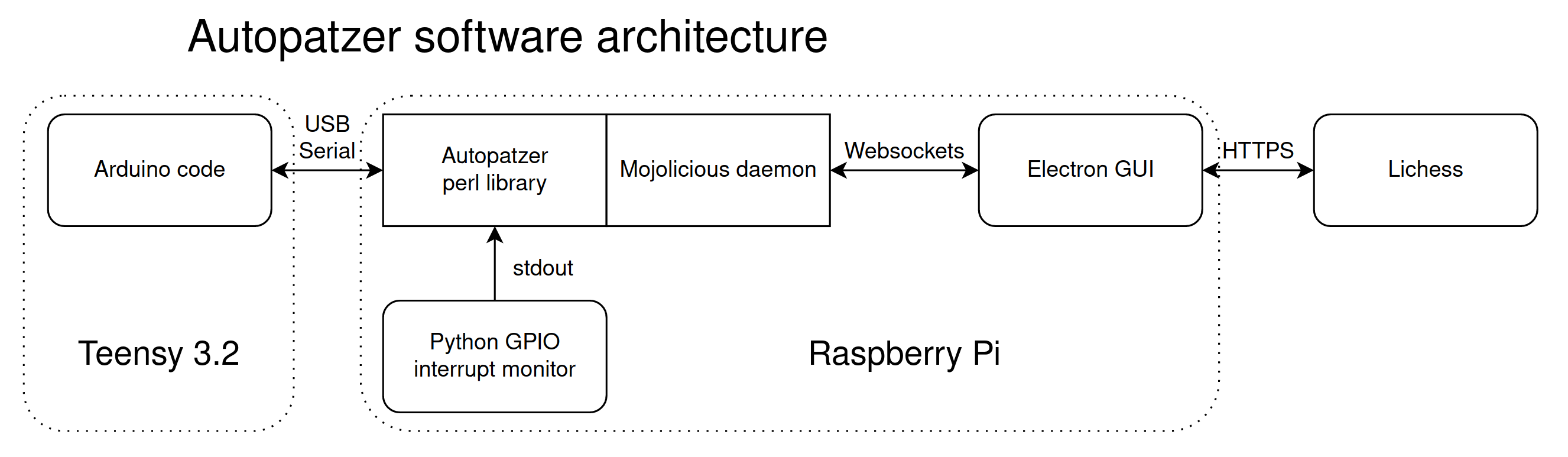 The touchscreen is there to allow seeking a game, offering/accepting a draw, and resignation, and displaying clocks, move history, and current input move. There is a Cherry MX blue keyswitch mounted on the plastic case which provides basically the function of a "clock button": having moved a piece, the user must hit the button to confirm the move and end the turn. Hitting the button triggers an interrupt on one of the GPIO pins (which I initially tried to detect in Perl, but RPi::Pin was causing segfaults, hence the Python program).