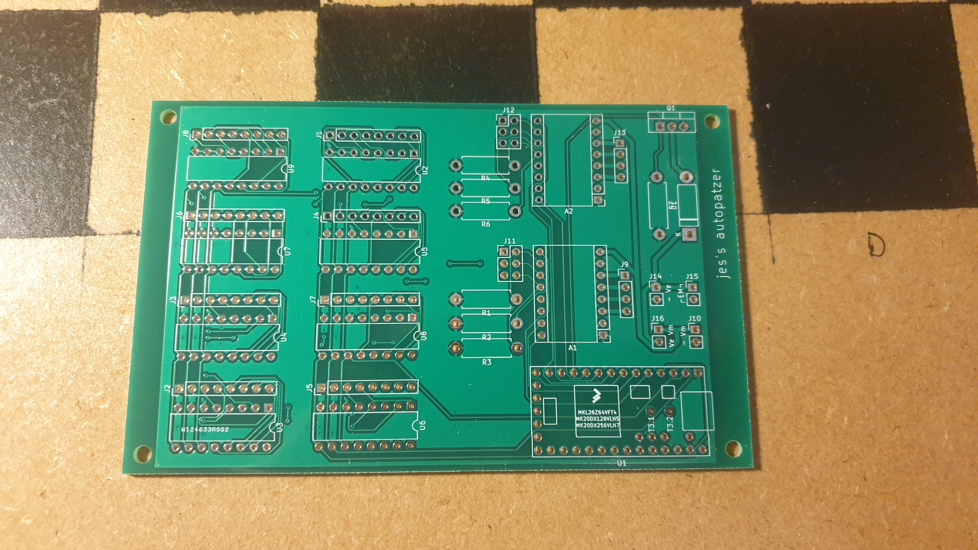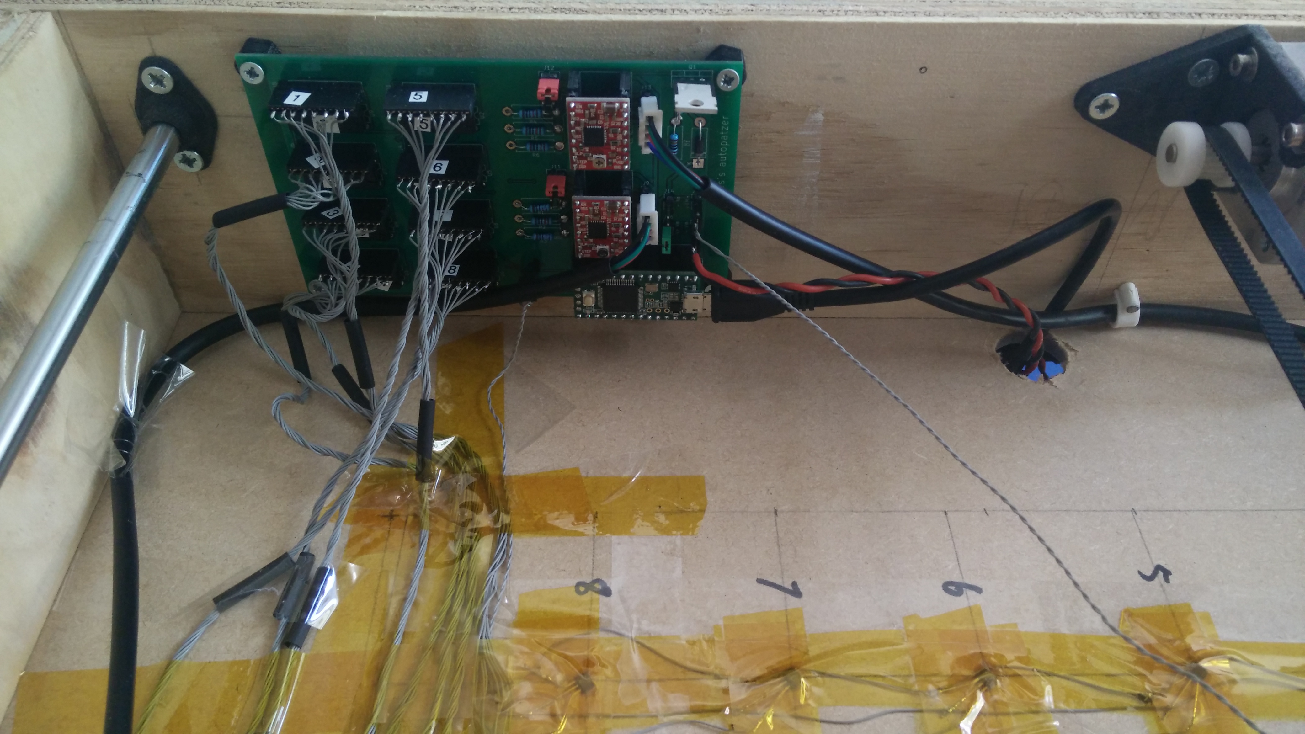 The electronics are controlled by a Teensy 3.2, which speaks to a Raspberry Pi over USB serial. All of the source code (and CAD models, and PCB design) are in the jes/autopatzer github repo.