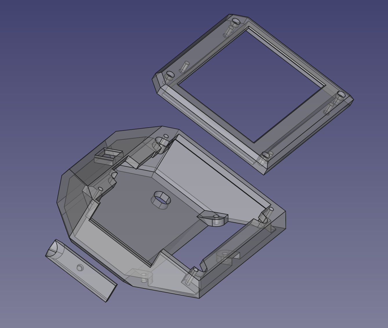 The HDMI touchscreen is held inside the top piece of the case with 4 3d-printed hold-down clamps, and the Pi is held to the touchscreen with a combination of the HDMI connector and (not pictured) the GPIO header plug on the back of the touchscreen: