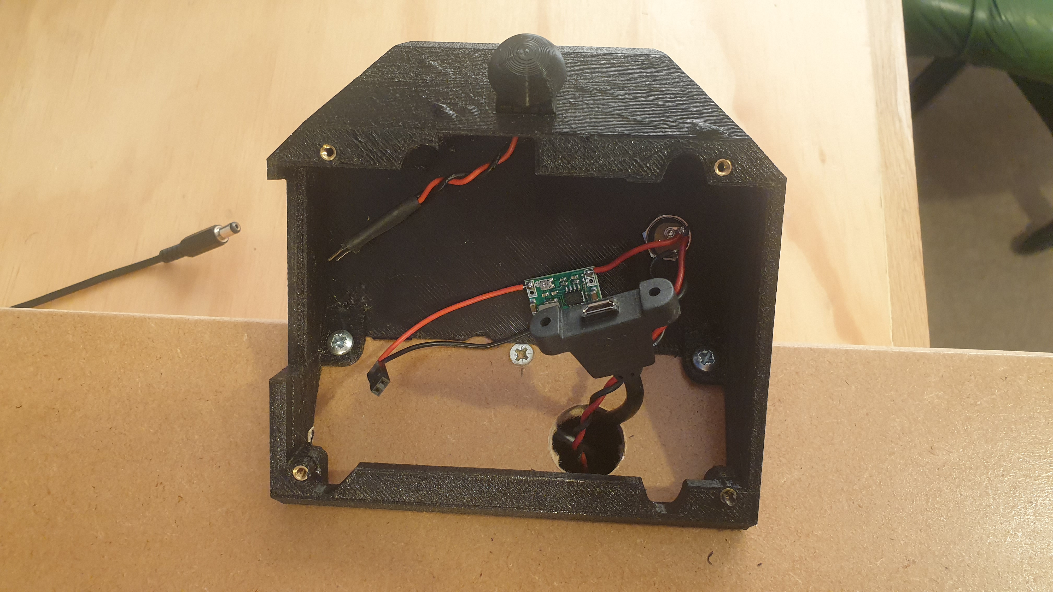 Not the best quality 3d printing but it'll do. The green PCB here is a buck converter to convert 19v from the power supply down to 5v for the Pi.