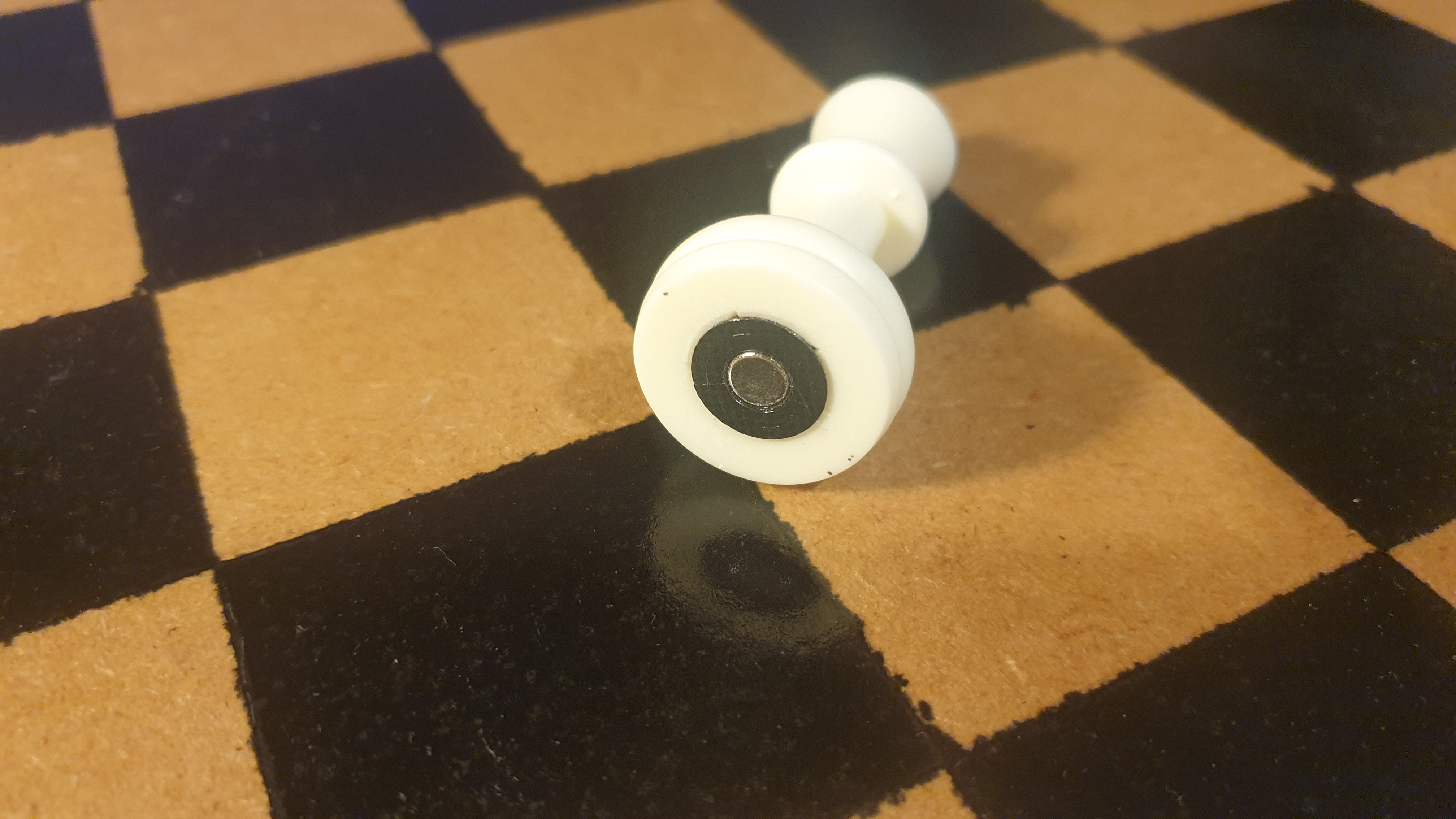 I took my pieces from a magnetic chess set that I already owned, but the original magnets were too weak. I removed the original magnets, but the holes were too large for my 6mm magnets, so I 3d printed some sleeves which push-fit into the bottom of the piece, and then the 6mm magnets push-fit into the sleeves: