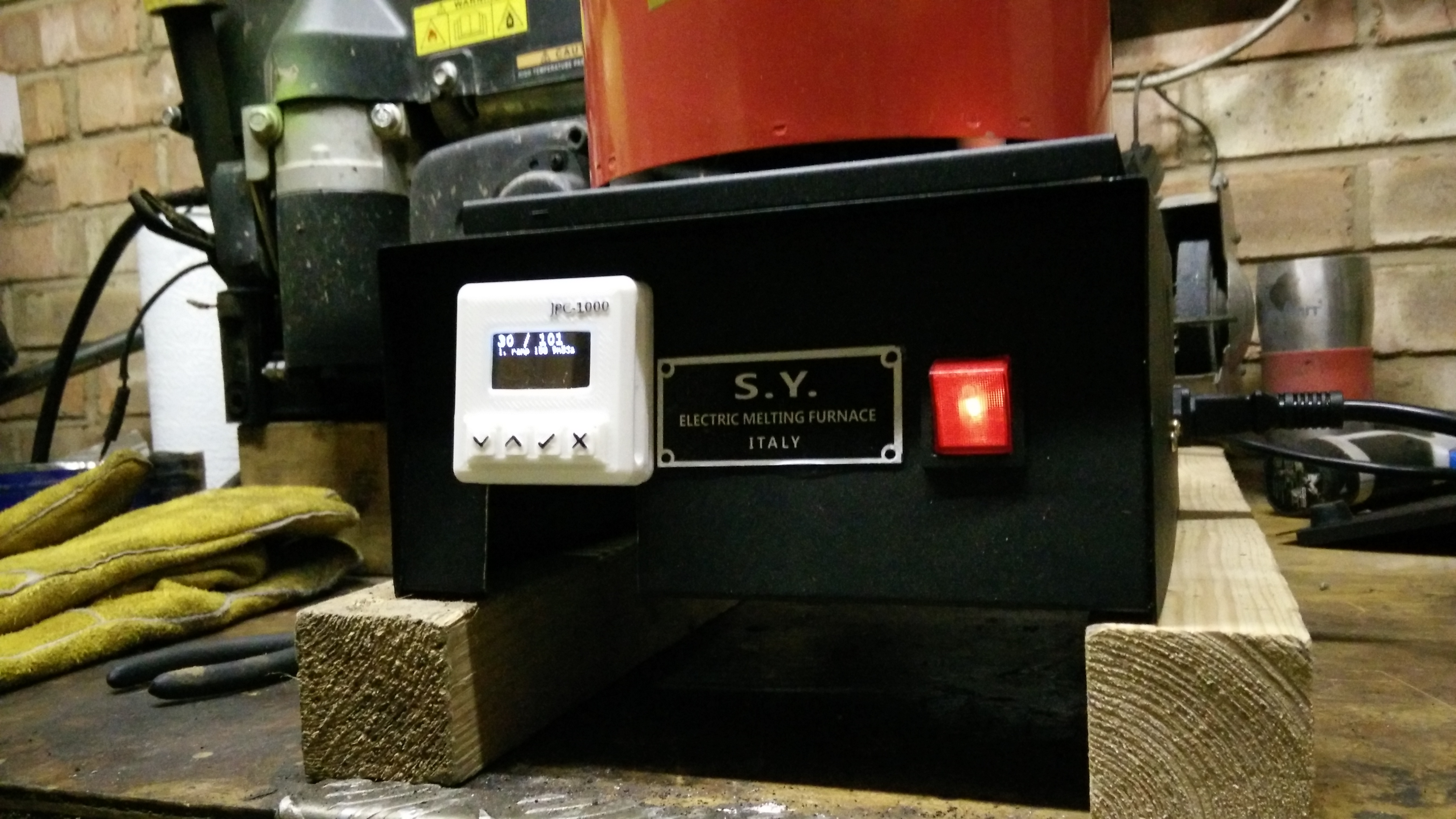 (This is an old picture of the JPC-1000 for illustration. It still looks the same, but I've put the feet back on now so I don't need to stand the furnace on wooden blocks.)