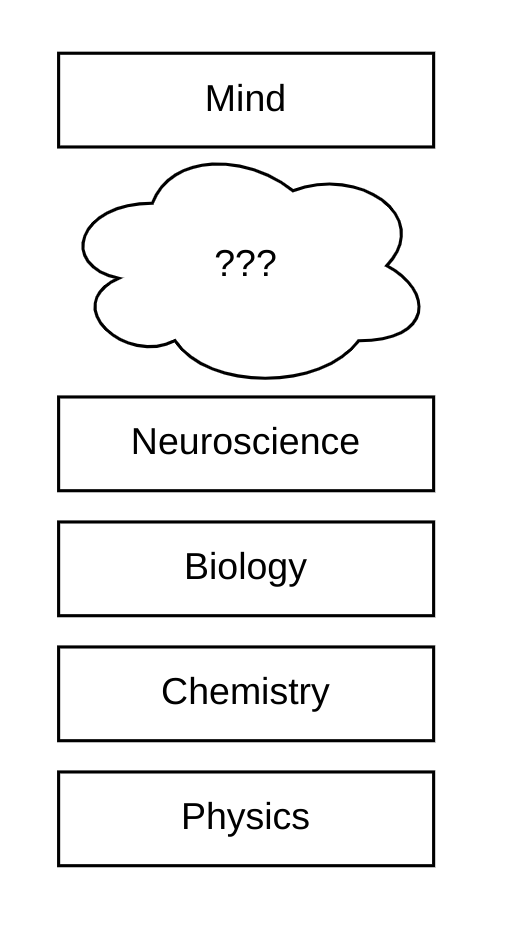I think trying to understand the mind in terms of neuroscience similarly disregards the tower of complexity that lies in the cloudy "???" zone.