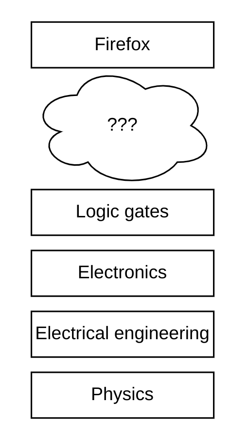 You would have no idea about the unimaginable tower of software complexity sitting underneath Firefox, and no studying of logic gates will explain it. Firefox seems to behave like a completely different type of thing to logic gates. And it is a completely different type of thing. You need to understand an enormous stack of abstractions before you can comprehend Firefox in terms of logic gates.