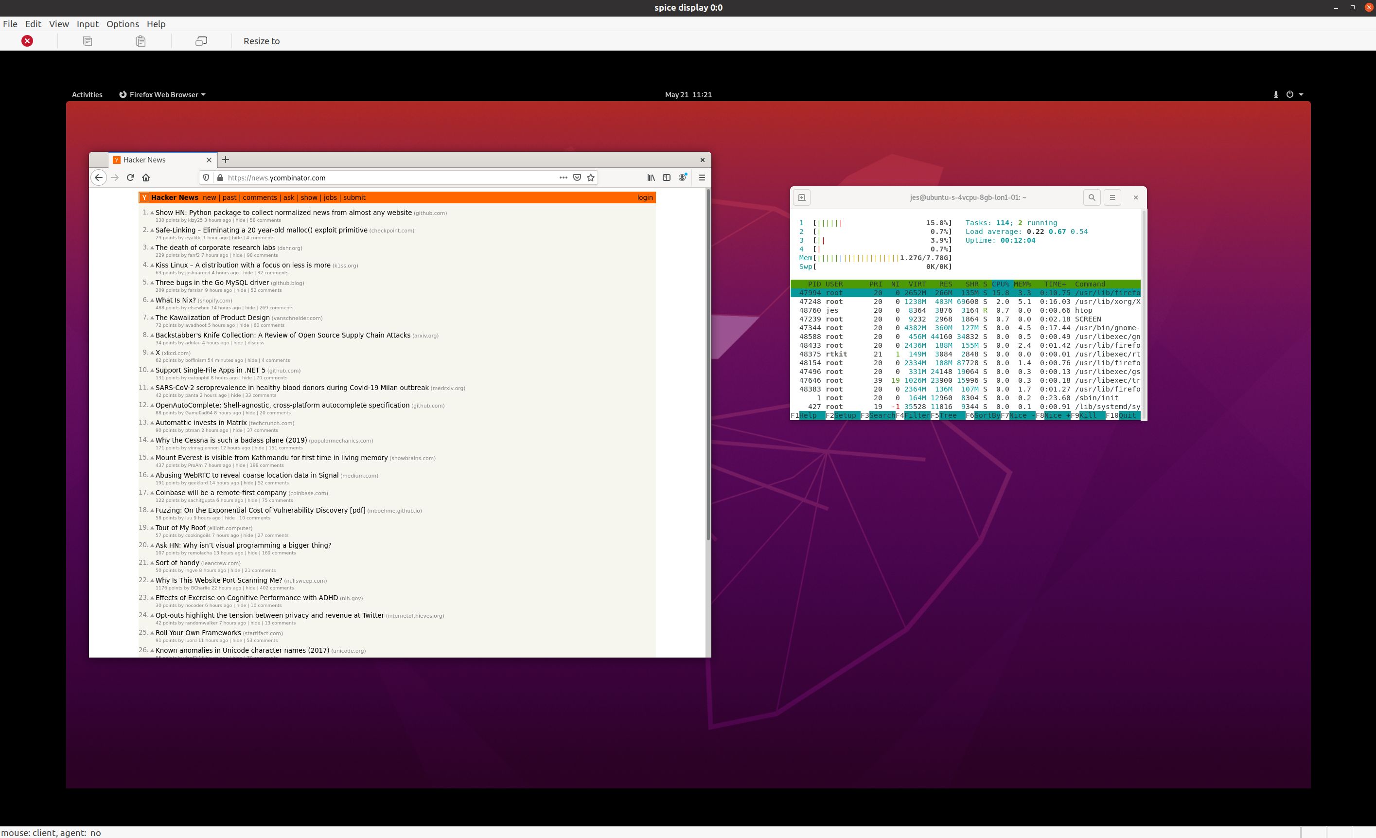Thu 21 May 2020SPICE is the graphical protocol used by QEMU since 2013. If you've started a VM with QEMU, including with virt-manager or Gnome Boxes, then chances are you have used SPICE. It seems to be the same concept as VNC but more efficient.