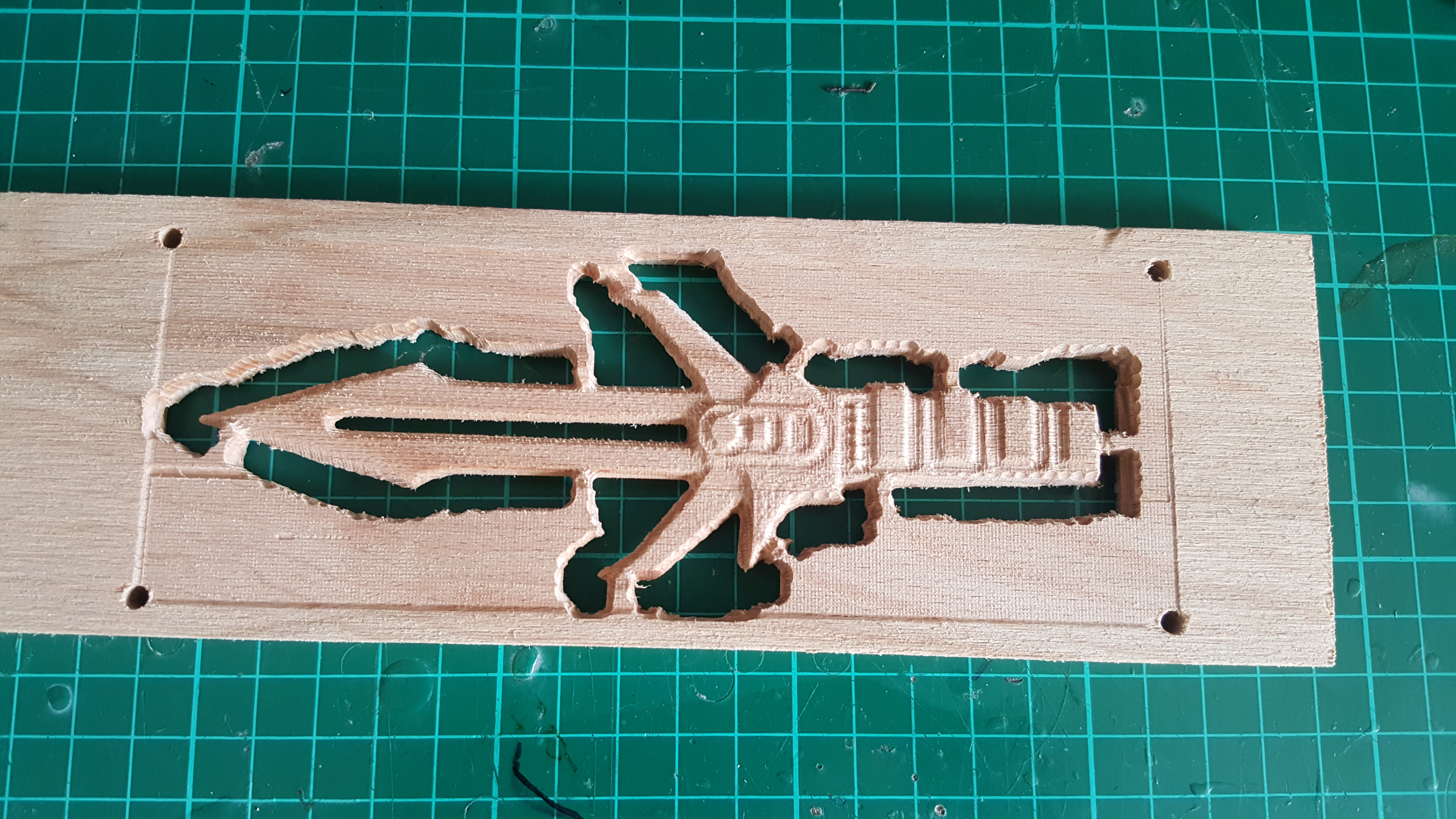 You can see there is one mistake: a vertical line cut too deep at the very top, about 1/3 of the way across. This was caused when the machine disconnected due to EMI and I failed to correctly realign the Z axis. I hit the emergency stop before it cut into the actual part, so no harm was done. I thought I had solved the EMI problem but it still happens occasionally, I'd like to get to the bottom of it. The USB cable I am using is shielded and has a ferrite choke on it, but maybe that's not enough? Or maybe the EMI is coming from inside the control box? Perhaps a grounded metal box around the Arduino would help? I'd be interested in hearing from anyone who knows about this stuff. Firstly on how to work out exactly where the EMI is affecting things, and secondly on what to do about it.