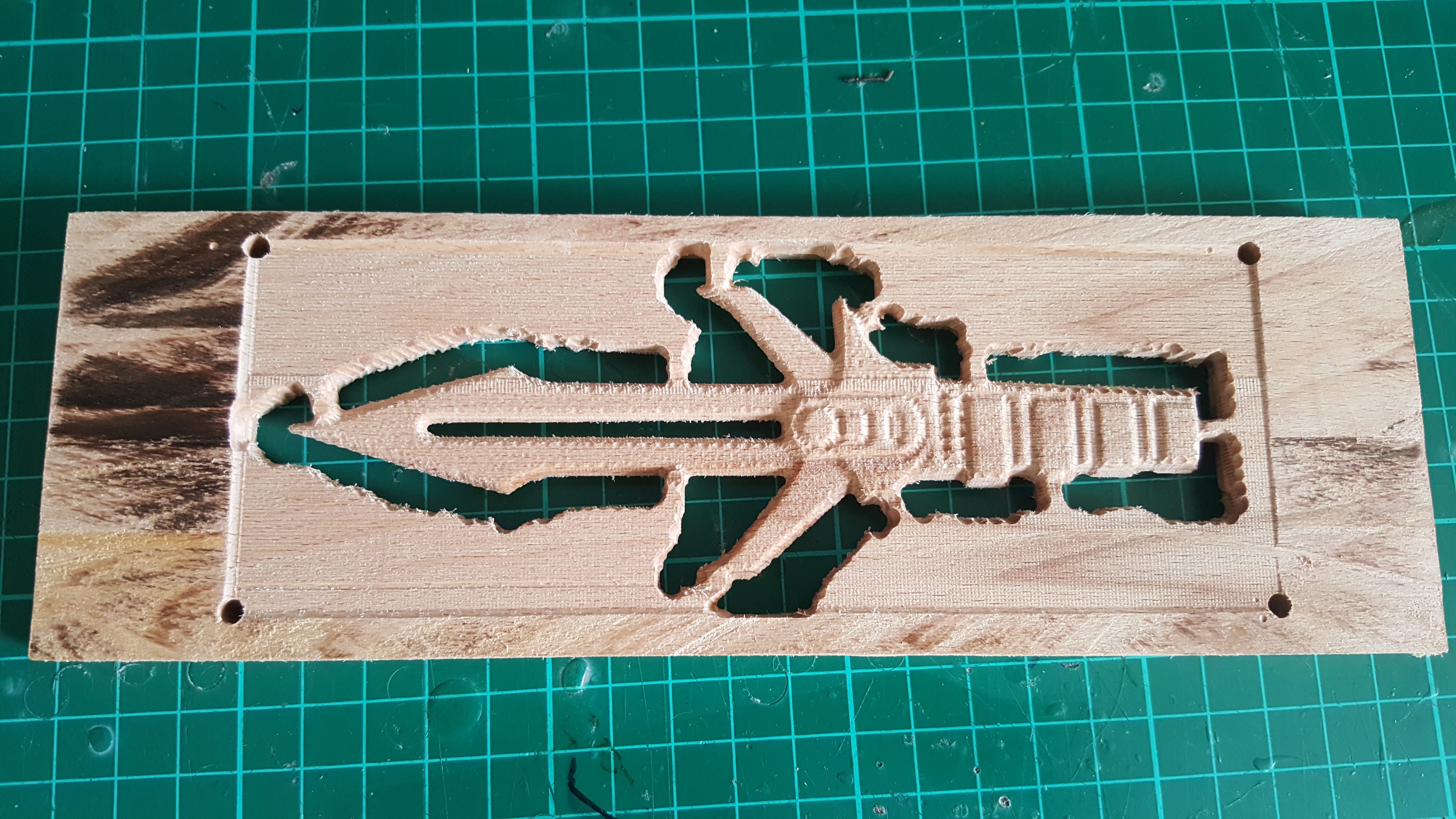 If we only wanted to cut the dagger out of one side, we'd be ready to go, but since we need the cut on the back side to be aligned with the front side, we need a reliable alignment plan. My approach to this was to manually mark out the rough rectangle in which I wanted the dagger, then drill a hole in the top left. I then clamped the wood onto the bed of the router, roughly square to the X and Y axes, and zeroed the coordinates on the location of the hole I drilled. Relative to this hole, I then used the router to drill holes in the other 3 corners. Then when I flip the part over I can pick up the alignment by checking whether the locations of the holes correspond to the correct coordinates, and adjusting the position until it does.