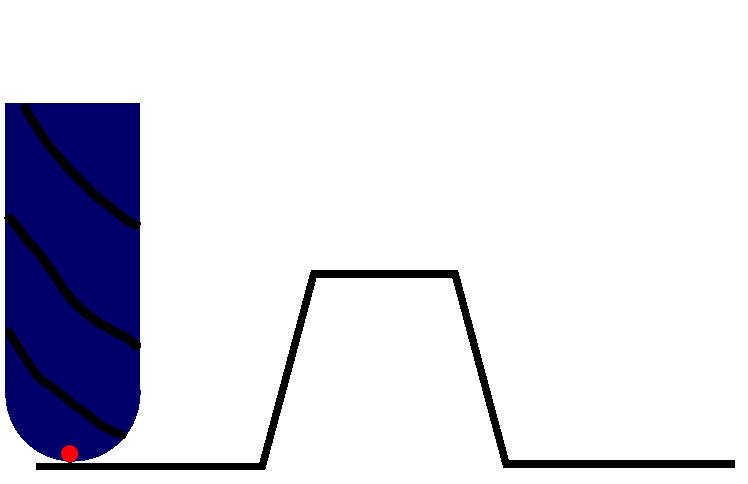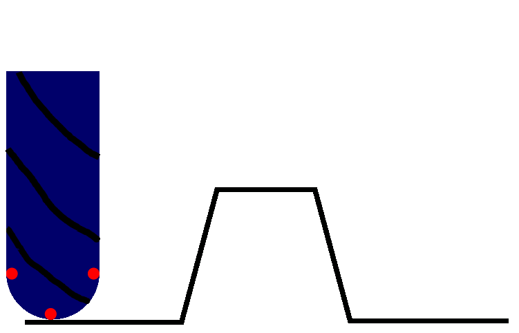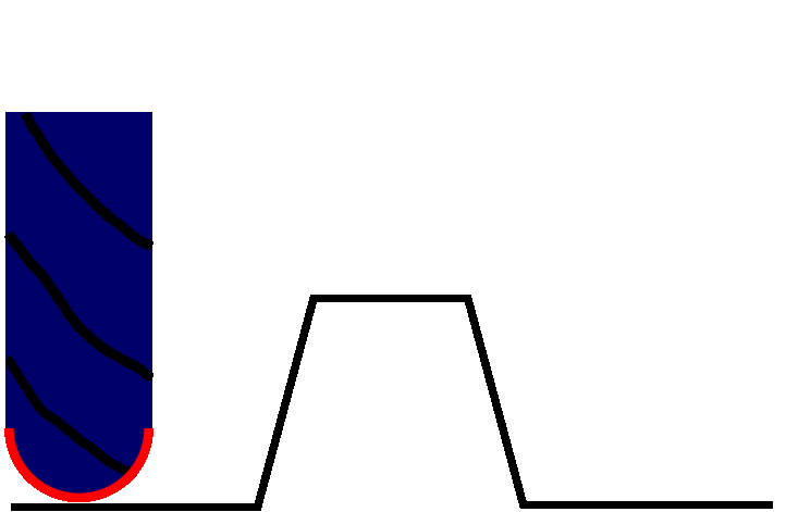The naive approach to this is to ignore the tool geometry and just take the Z height at a given X/Y coordinate directly from the brightness at the corresponding pixel of the image. Here's an animation of what happens in 2 dimensions with this idea. The blue thing with black stripes is supposed to represent a ball-nose end mill. The black line is the desired part geometry. The red dot is the point we've sampled from the heightmap image: