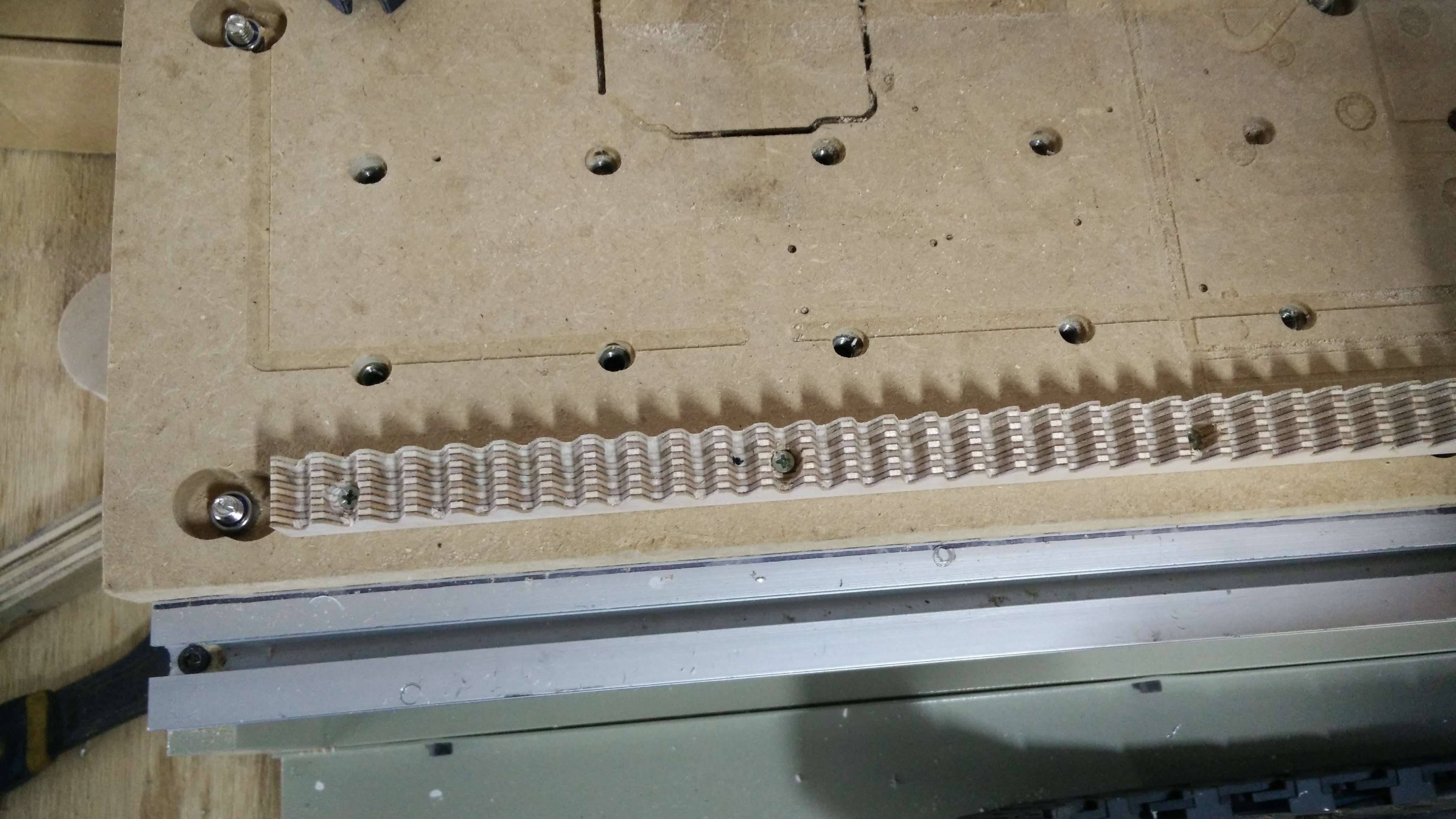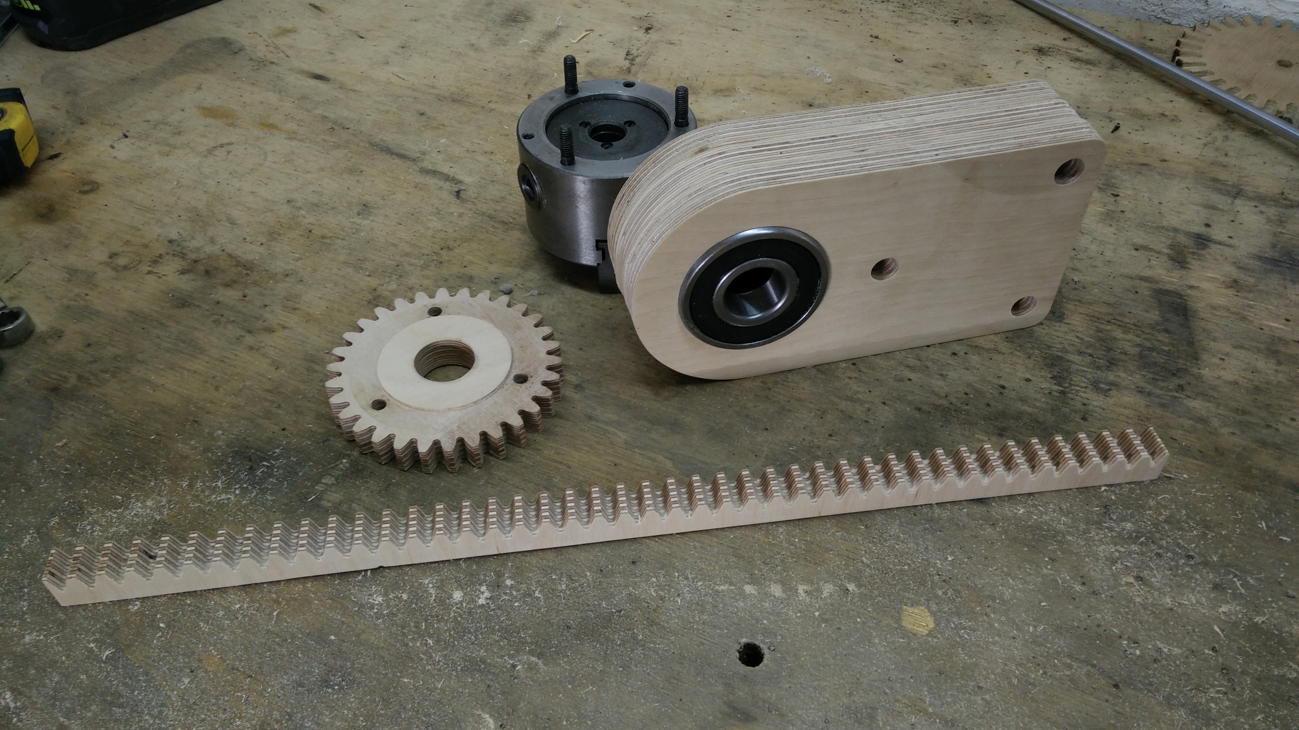Making the plywood parts is easy, it's just normal CNC work. They're made out of offcuts of Russian Birch plywood that I bought for my SCAMP case. I really like this material, it leaves a nice crisp cut with very little tearing. There are only 5 parts: the gear, the rack, and 3 identical plywood plates, with a bearing pressed into each of the outer plates.