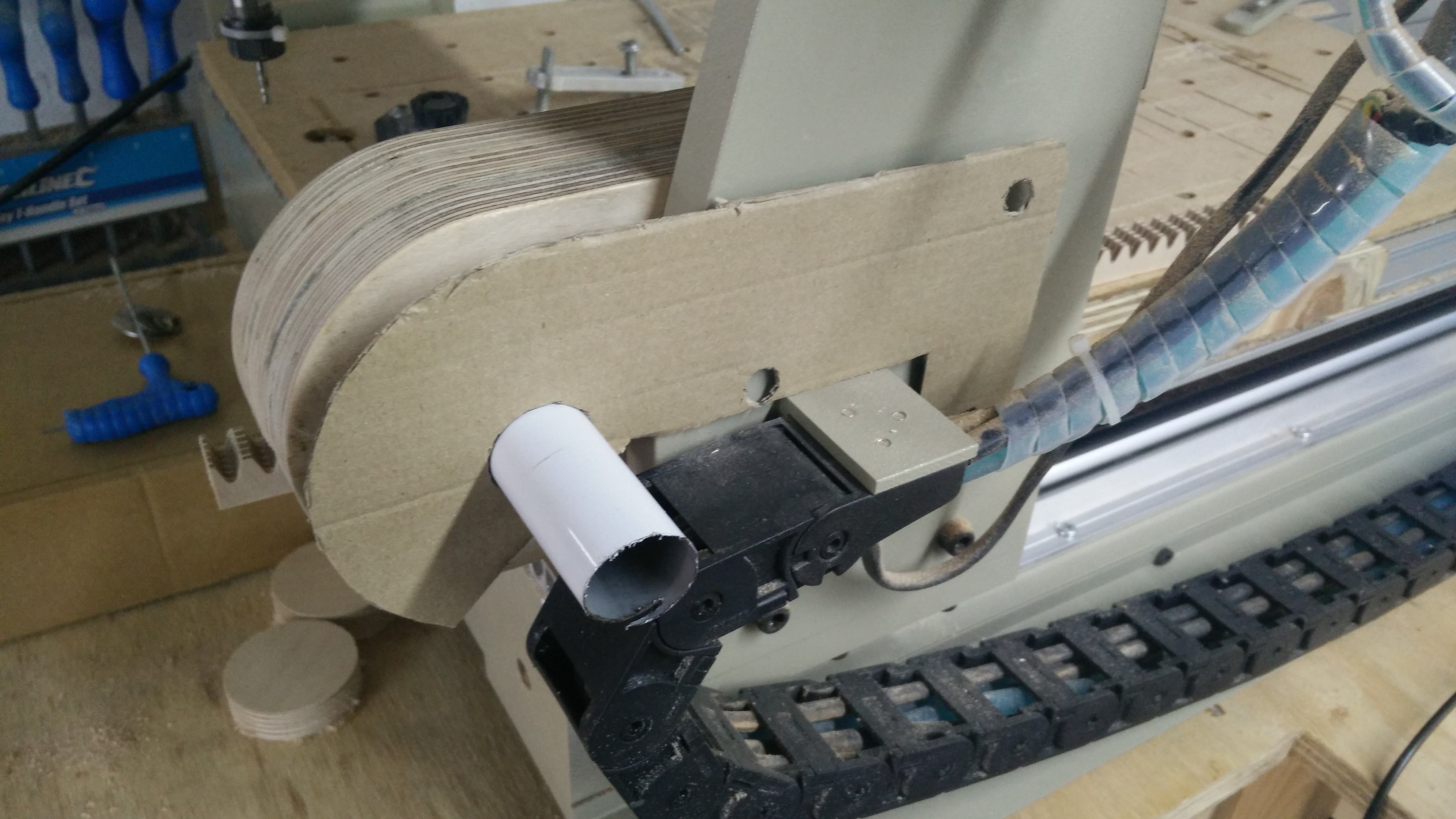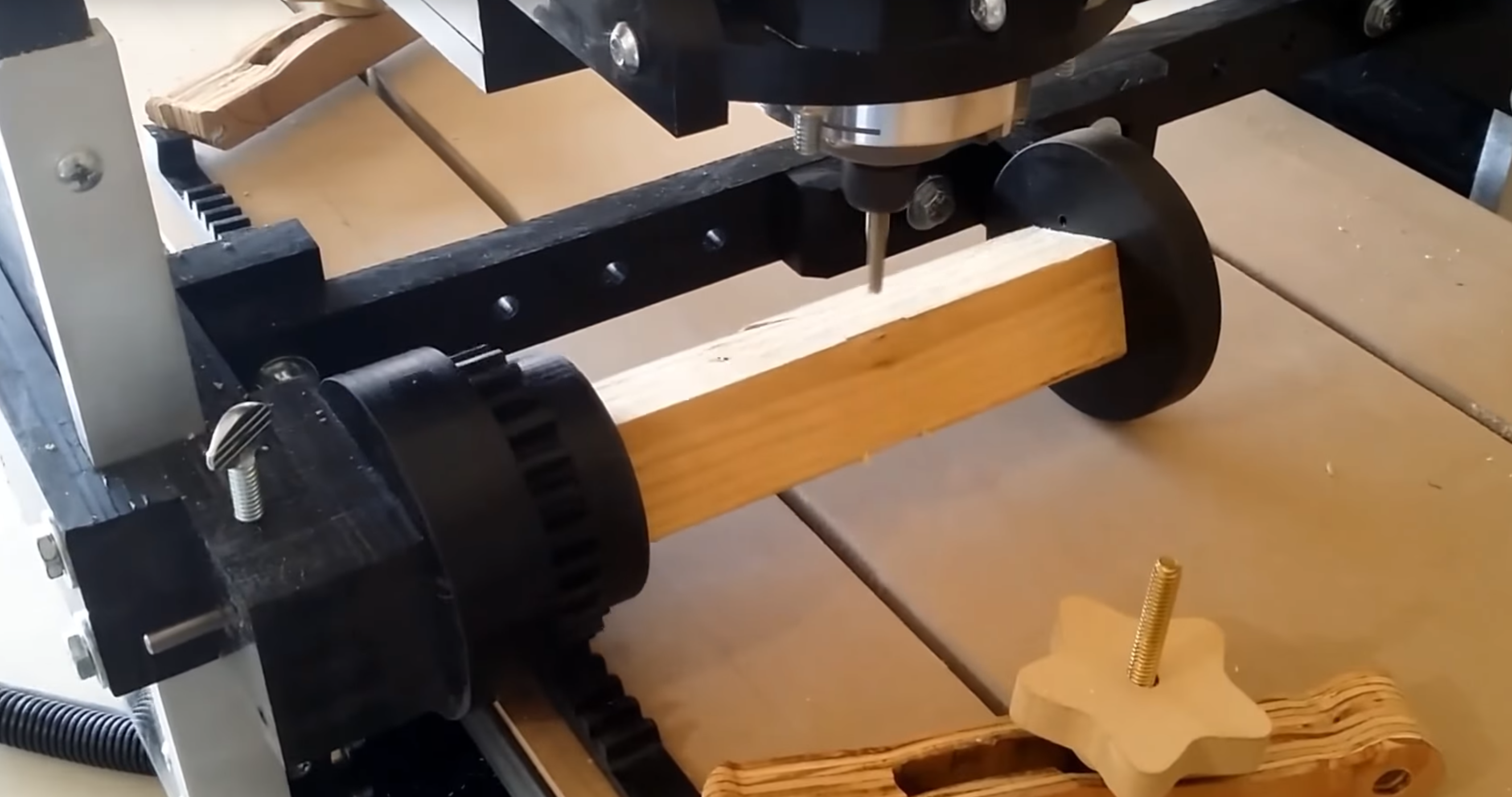 On a "normal" 4th axis, you can spin the part around and around forever, but with the one I have built there is a very limited range of motion, because if you try to move the Y axis too far you fall off the end of the toothed rack. This also means that we can't easily use traditional 4-axis CAM software, because it doesn't know that it has to "rewind" periodically to stop itself from running out of bounds. But my CAM software of choice is FreeCAD, and that doesn't support a 4th axis anyway.