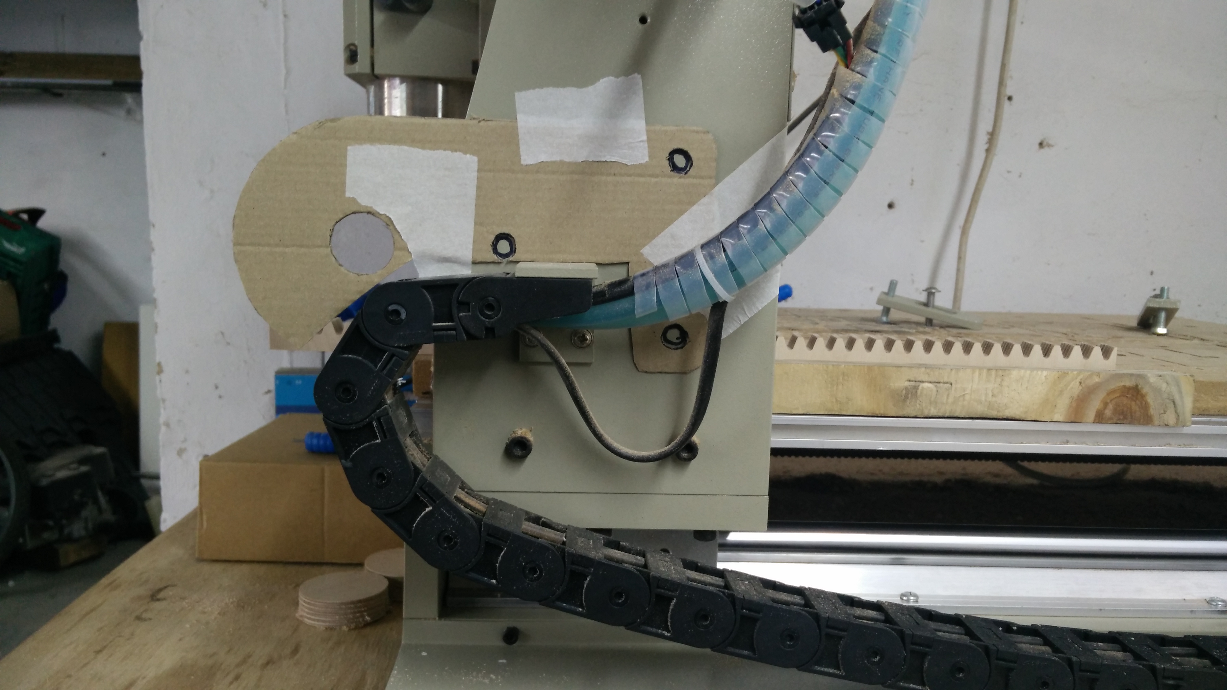 Next we need to bolt the mounting plates to the gantry. I cut out a cardboard template and aligned it with the approximate required position of the mounting plates, marked the holes on the gantry, and drilled them: