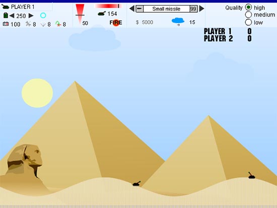 Each player has a tank on a hillside, and has to try to shoot a bullet at the other players' tanks, by adjusting the gun angle and firepower. Gravity acts on the projectile so that it travels in a parabola.