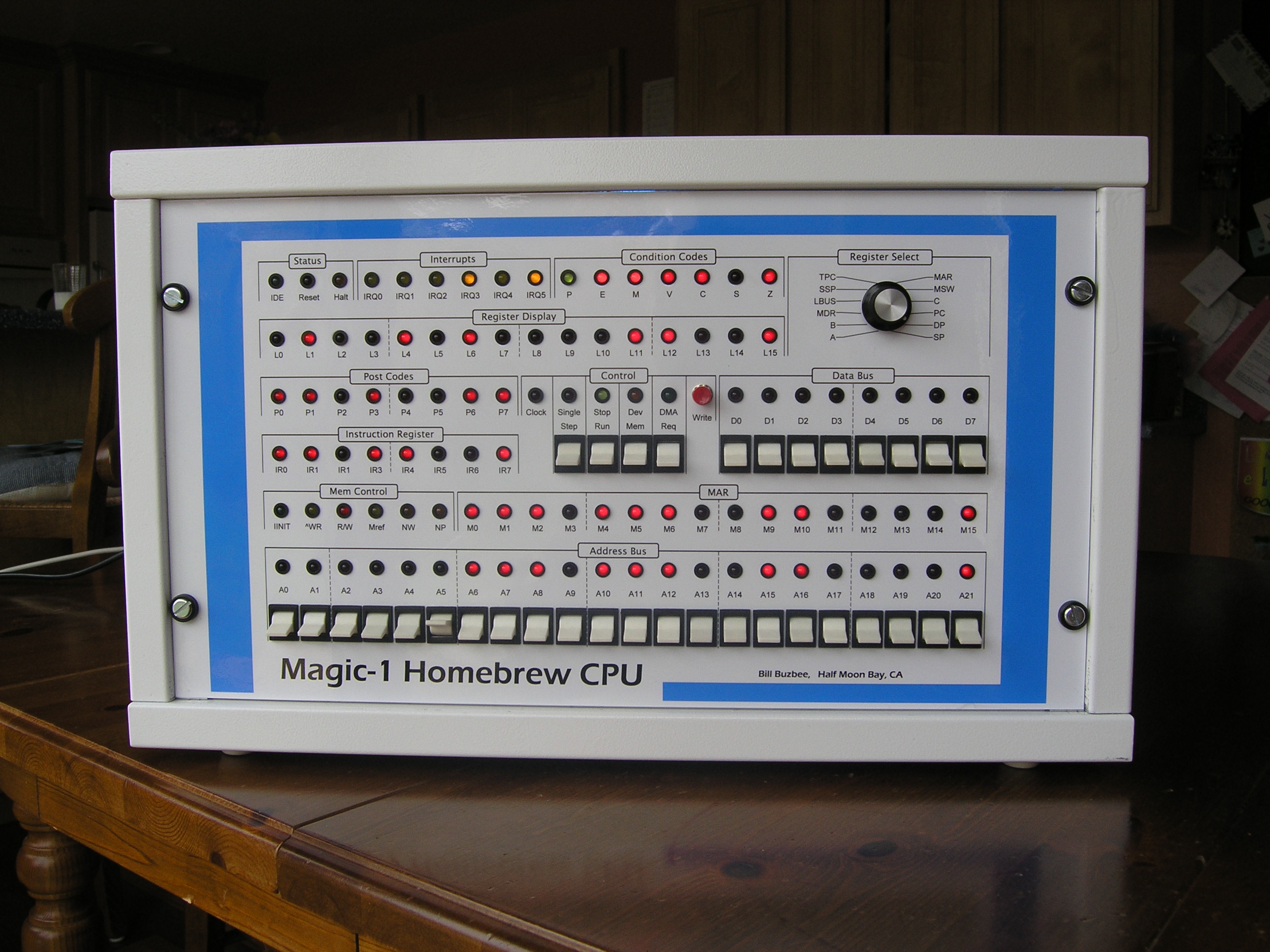 I've been a fan of Magic-1 for a long time. It is the most technically-advanced DIY CPU that I am aware of (not counting FPGA designs). It has 16-bit addresses, but uses an MMU to map 4MB of physical memory into a 64K code segment and 64K data segment for each process. It also supports interrupts and memory protection, and runs a port of Minix. Really an incredible project. And it's all done with only about 200 ICs, and uses wire-wrap construction instead of soldering.
