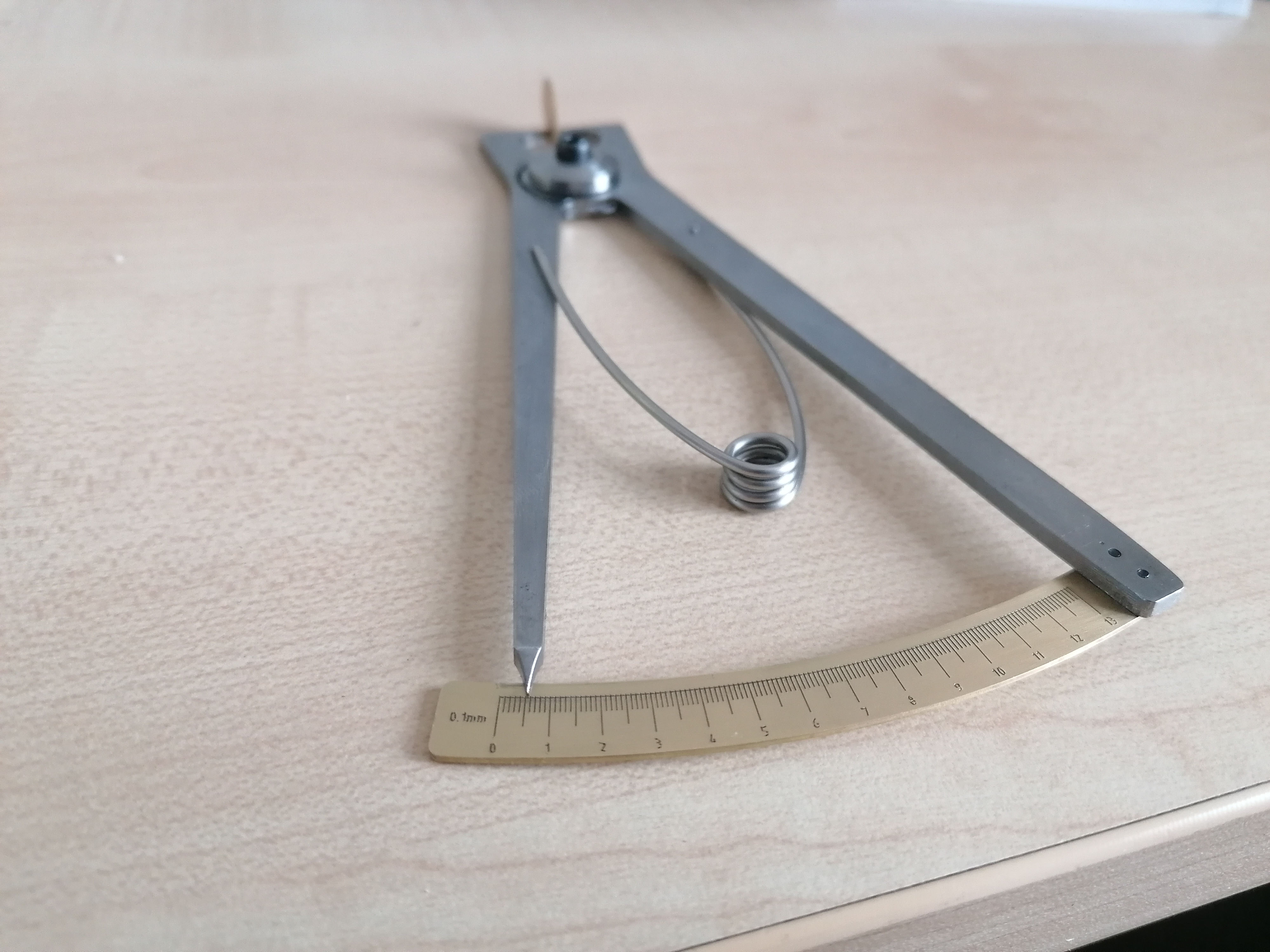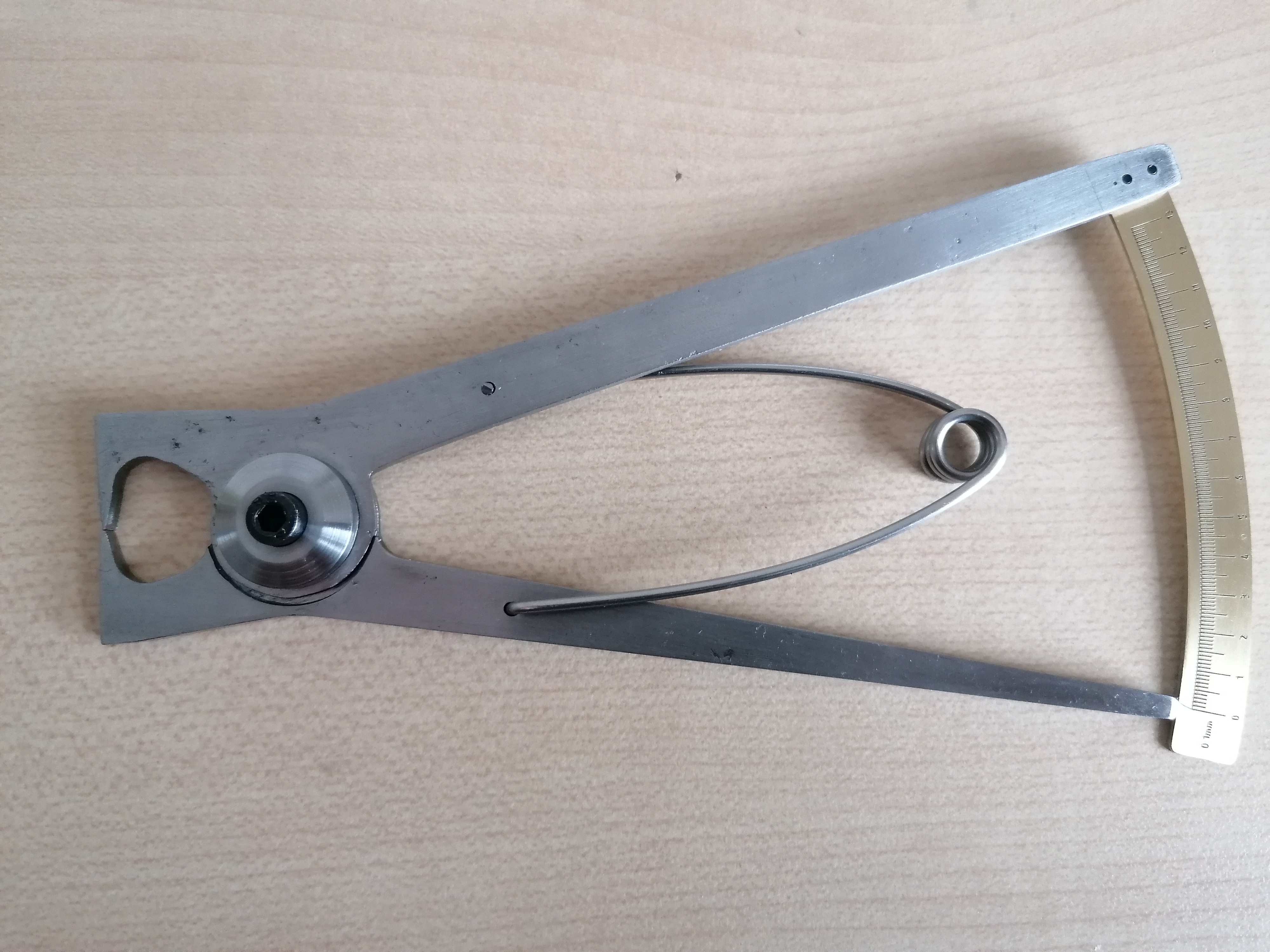 If you design one of these, then you should take note that the lines on the scale should not strictly be spaced at equal angles, because what you are really measuring is the chord length rather than the arc length. However the error if you space them at equal angles is so small that you can probably ignore it. I did go to the trouble of spacing them correctly the first time, but then realised I had messed up the alignment and couldn't be bothered doing the several-hundred clicks in LibreCAD to rescue it, so I started again and went with equal angles. Maybe if you are better at LibreCAD than me you could do it properly.