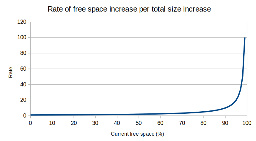 The function is y = 1 / (1 - x), where x is your current used proportion (on a scale of 0 to 1), and y is the ratio of free space increase to total size increase.