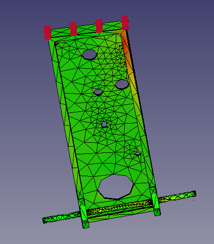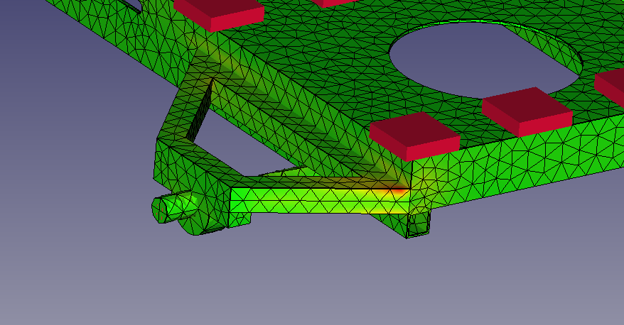 This test has the front edge of the chassis fixed in place, and a 4000N force upwards on the left edge of the rear axle (right in pic). It's an unrealistic model because a 4000N force on the rear axle would be enough to pick up the rear end, rotating the entire mower around the front axle. The front end wouldn't remain fixed in place. But the test still highlights a potential weak point.