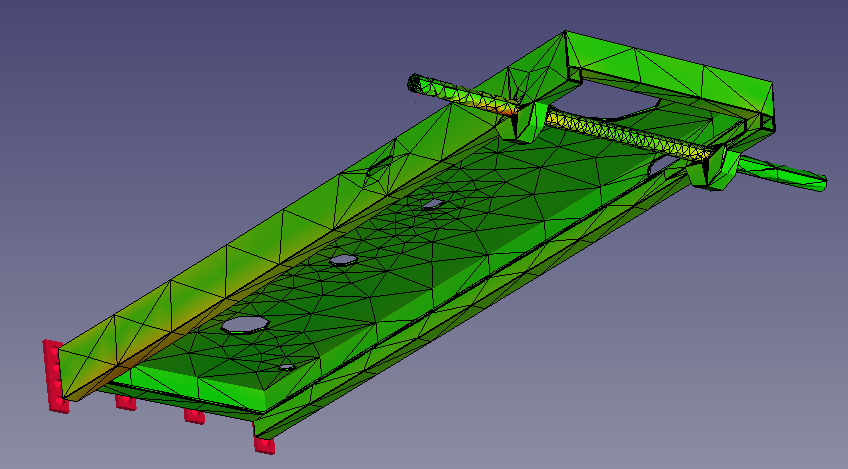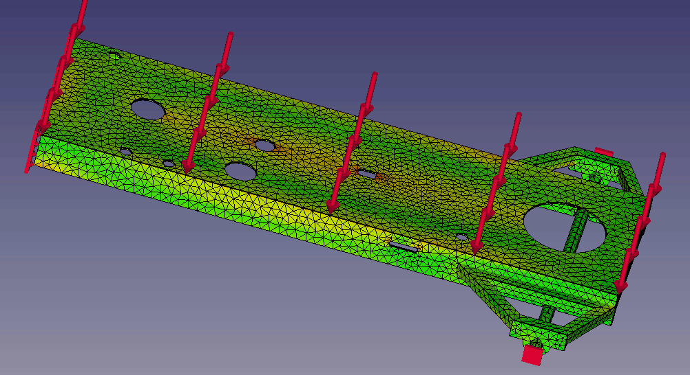 A limitation of the FreeCAD interface is that you can't apply a force to a small area of a large face. If you want to add a 4,000 Newton load to the top of a flat plane on your chassis, FreeCAD is going to distribute it over the entire area and provides no way for you to localise the force to a smaller area. If you really need this, a workaround is to extrude a very short pad (say, 0.01mm tall) in the area you want to apply the force so that you get to define the shape and size of the force area without significantly affecting the mesh of the part. I didn't bother with this.