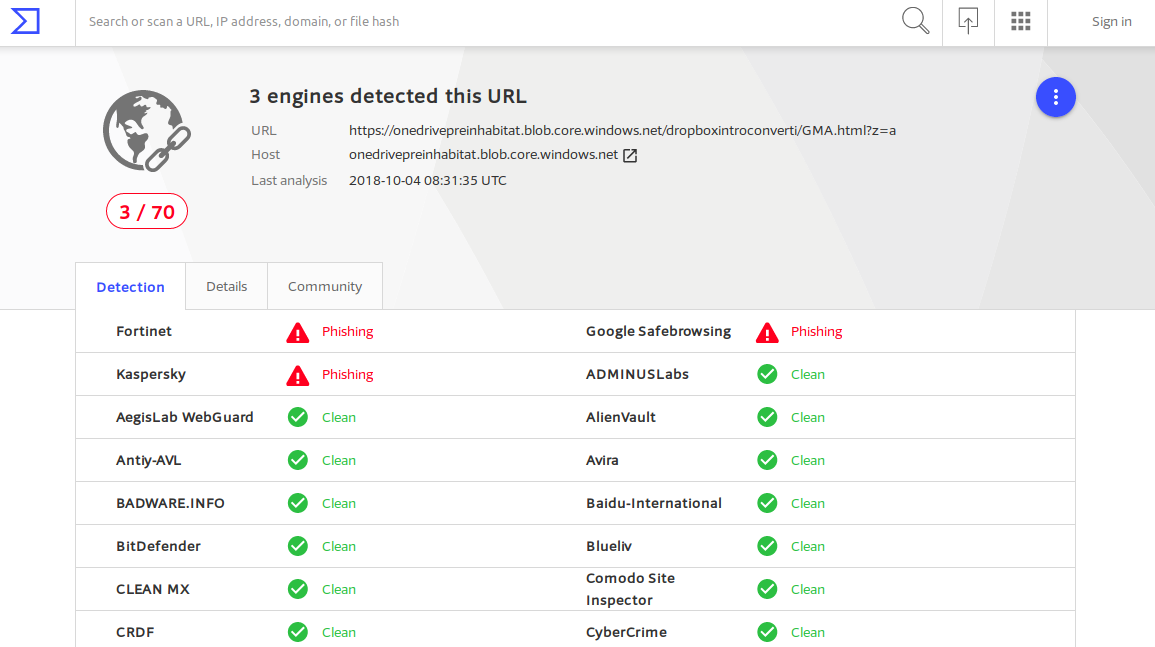 Only 3 of the 70 anti-phishing companies are actually classifying this URL as a phish. That is surprisingly poor.