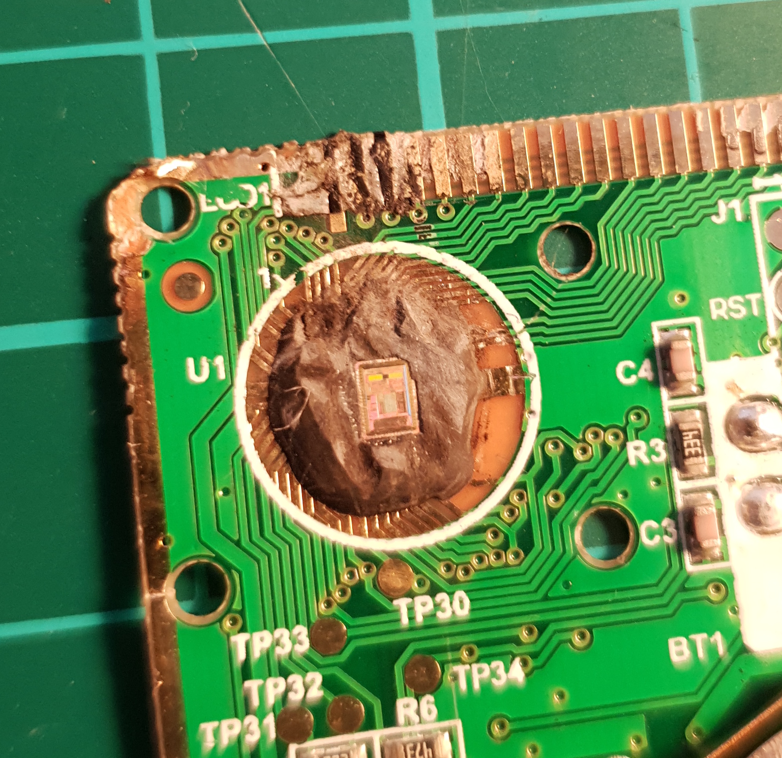 I found it more convenient to use a soldering iron than a heat gun, but the process went much the same as depicted in Kai's video. Just keep heating and cutting and scraping until the die is fully exposed.
