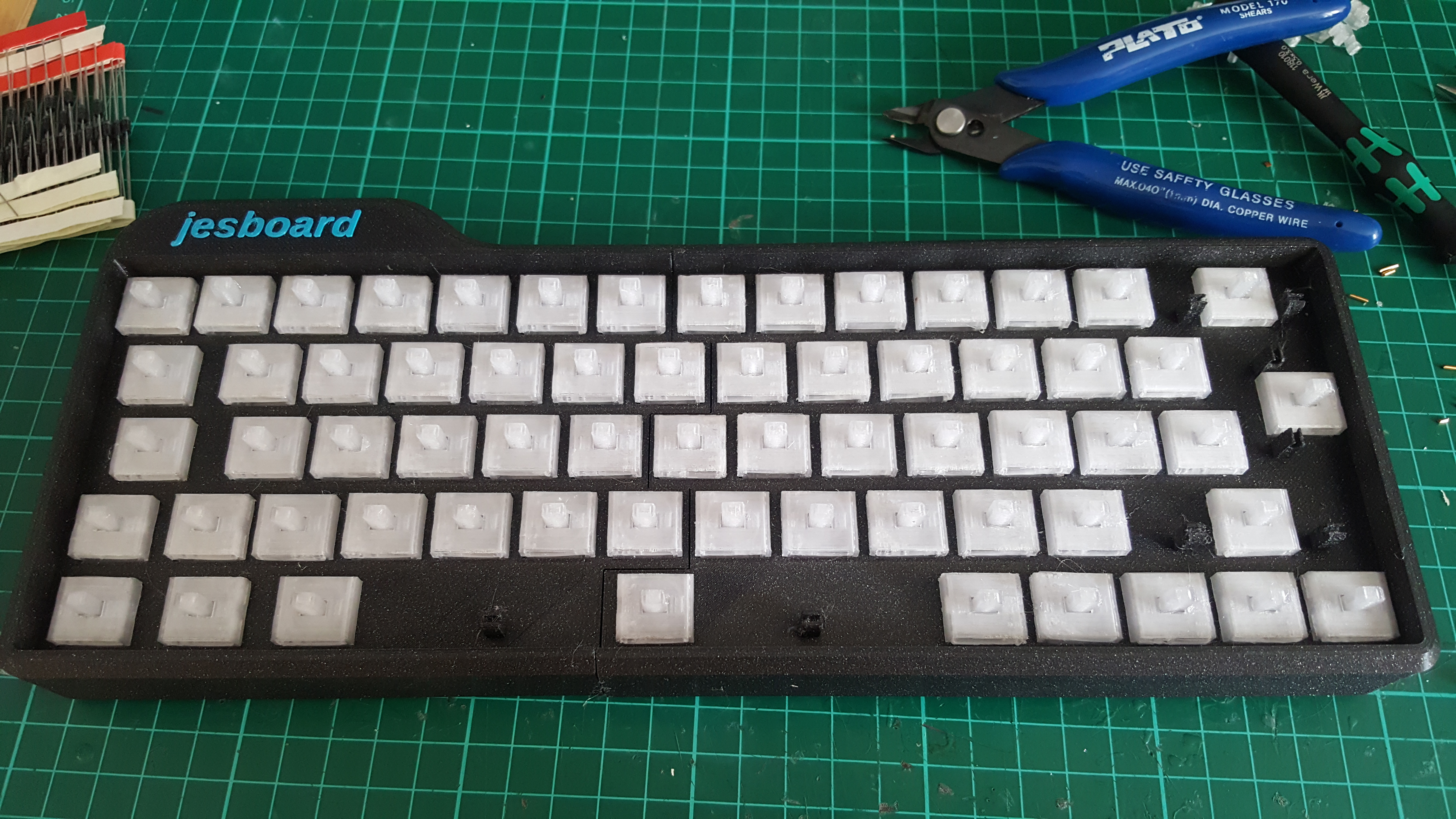 That said, I started using the jesboard to write this blog post, and it was too annoying to type on so I went back to the Filco. Spending some time typing on my homemade switches has given me a newfound appreciation for just how good Cherry MX switches are. I'm not sure what it is that makes the jesboard so unpleasant to type on, there's just a general vagueness to it that makes typing frustrating. Pressing a single key up and down feels basically fine, which is why I hadn't noticed this problem while developing the switches. But trying to use it as an actual keyboard, and type at a sensible speed, just feels really bad. It is genuinely the worst keyboard I have ever used. So that's disappointing.