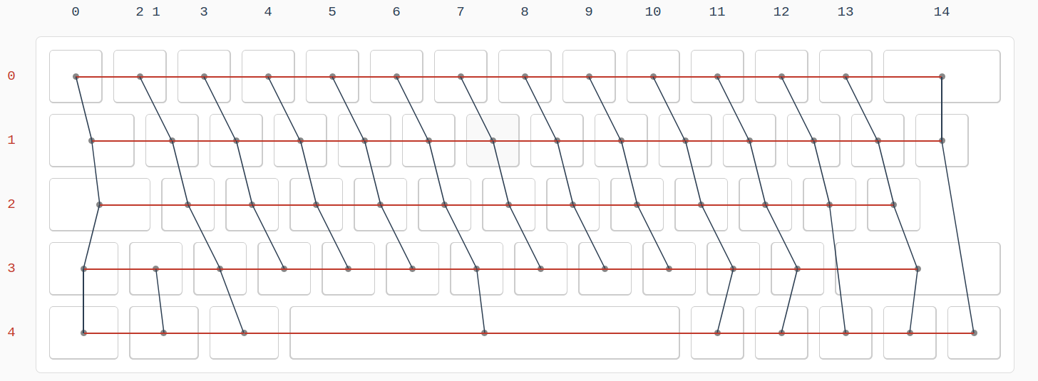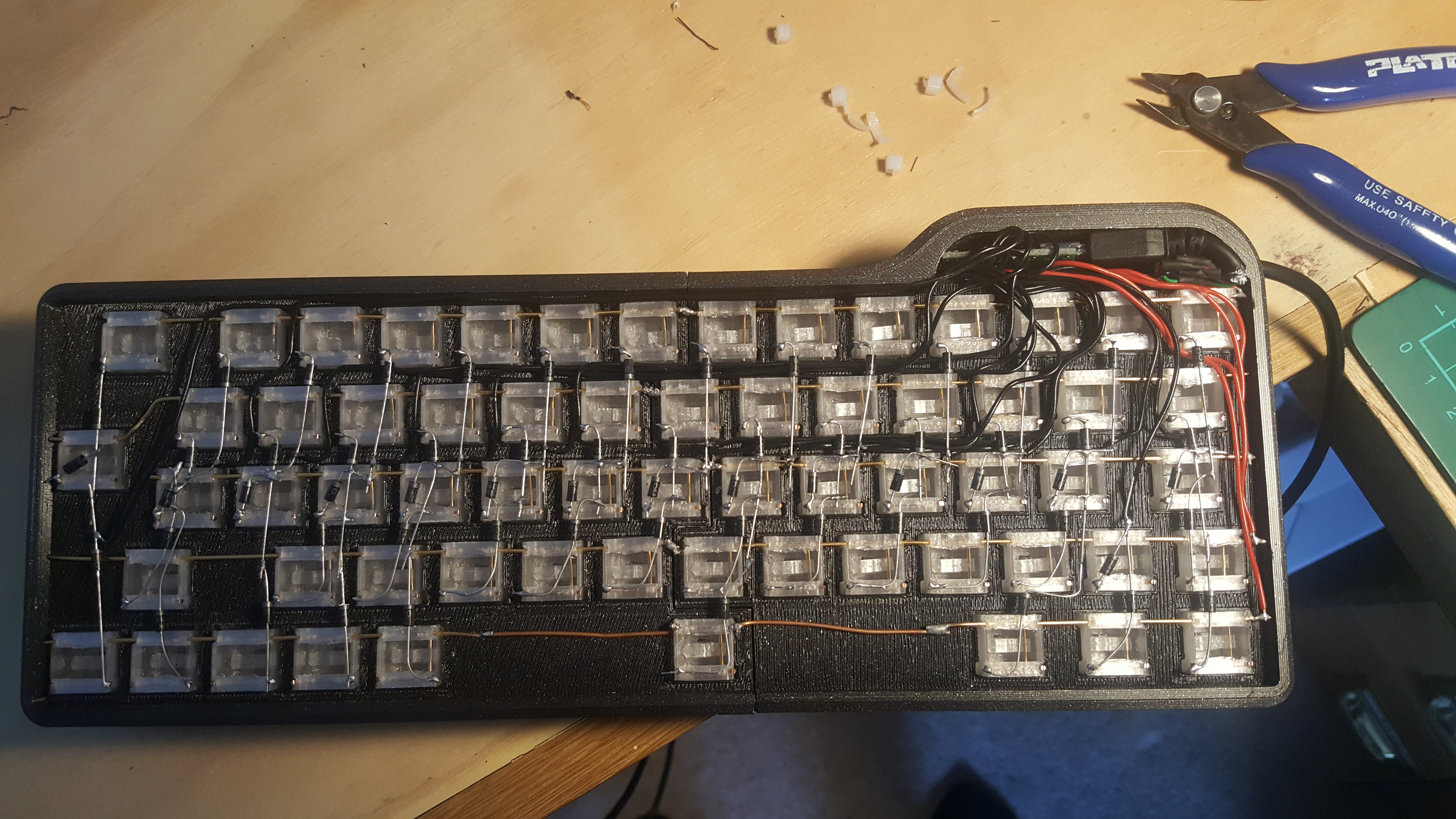 The switches are hand-wired in a 15x5 keyboard matrix, with diodes allowing current to pass only in one direction. 14x5 would be enough if you thought about it a bit more than I did, but 15x5 is fine.