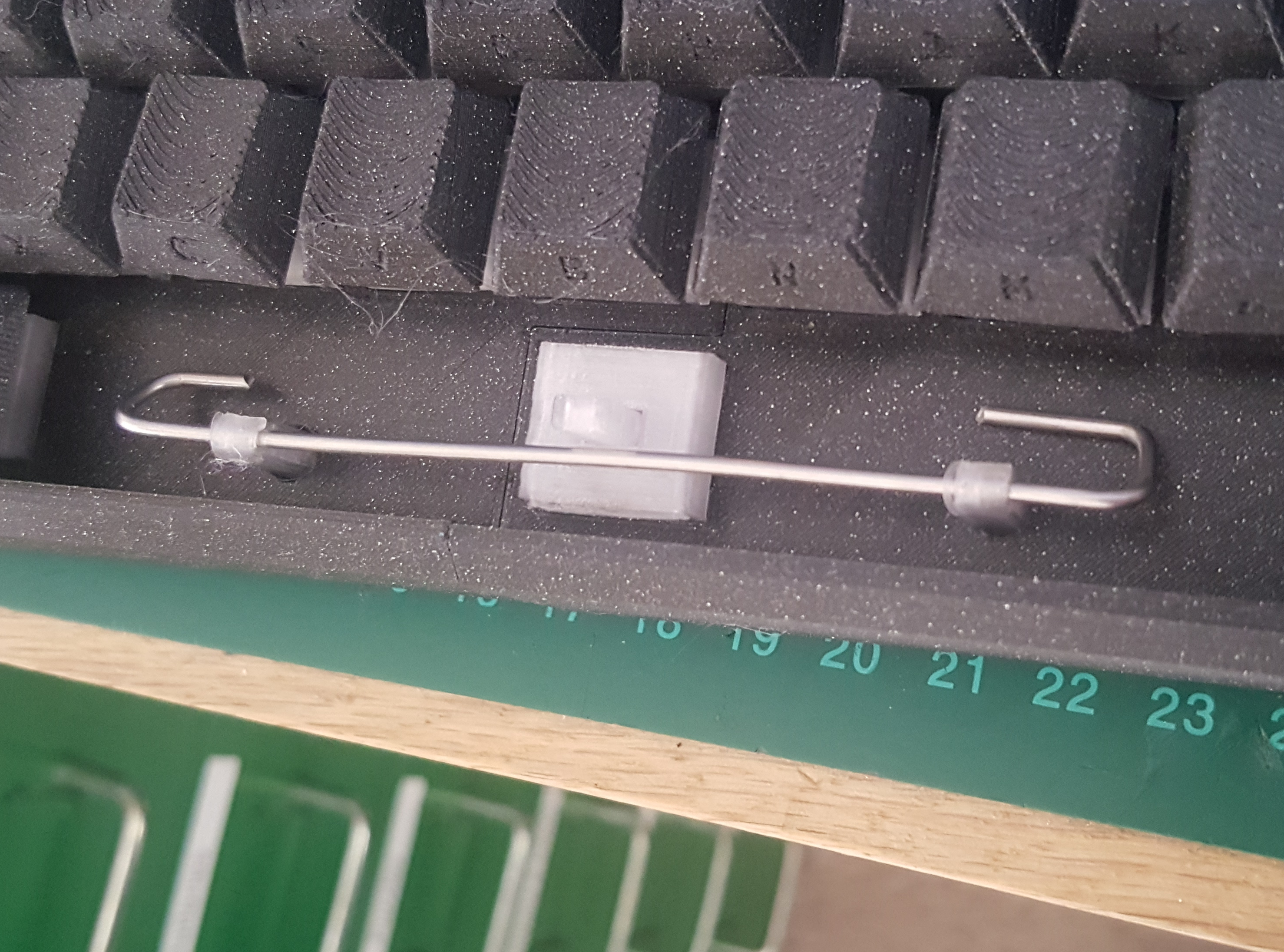 The idea is that when you press down on one side you cause the bar to rotate, which then pulls down on the other side of the switch, forcing the key to move down parallel (instead of rocking) and activate the switch properly. The bar is made of 1.75mm stainless steel wire bent into a suitable shape. Thick stainless wire is quite hard to cut, but doable with a big-ish pair of nippers.
