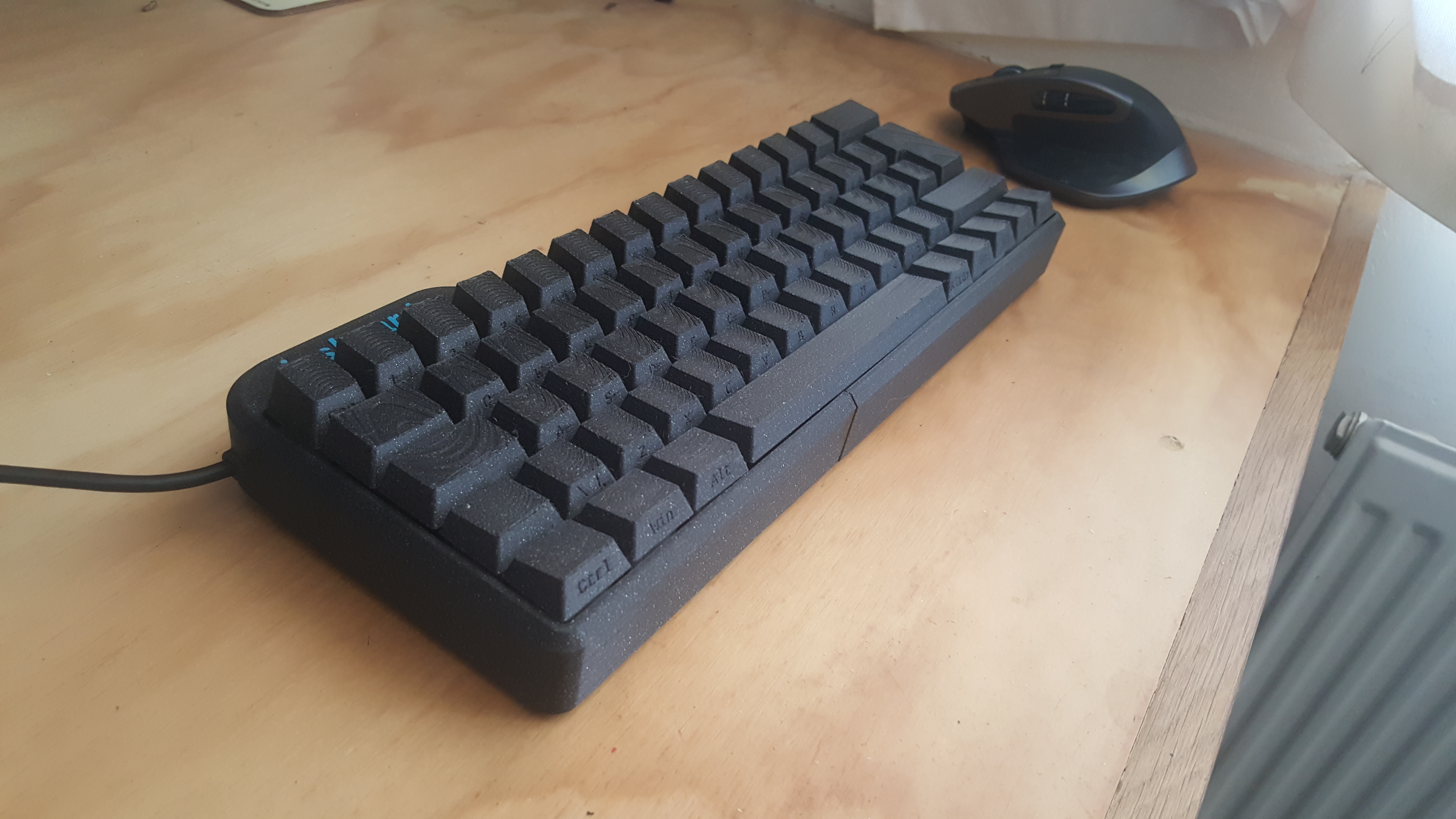 Apart from the fact that the keyboard is quite unpleasant to type on, I'd say this project was mostly a success. I enjoyed the process of developing the switches, but although there is obviously more work that could be done, I think I've had quite enough of it. I think my mistake was optimising for reliability instead of feel. If you want to work on 3d-printed switches, I would suggest focusing primarily on the switch feel, and only optimise for reliability once you have switches that feel good to type on.