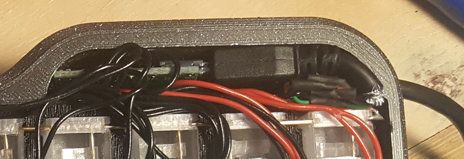 The other part of the wiring is that the USB cable has to reach the microcontroller. I left a 4mm hole in the side of the case for the cable to run through, but this is too small for the connector on the end. I was originally planning to cut the connector off and solder the wires directly to the USB pads on the micocontroller board, but they were too small and annoying to access, so instead I just soldered the MiniUSB end back on and plugged it in. It's a tight fit but it does the job.