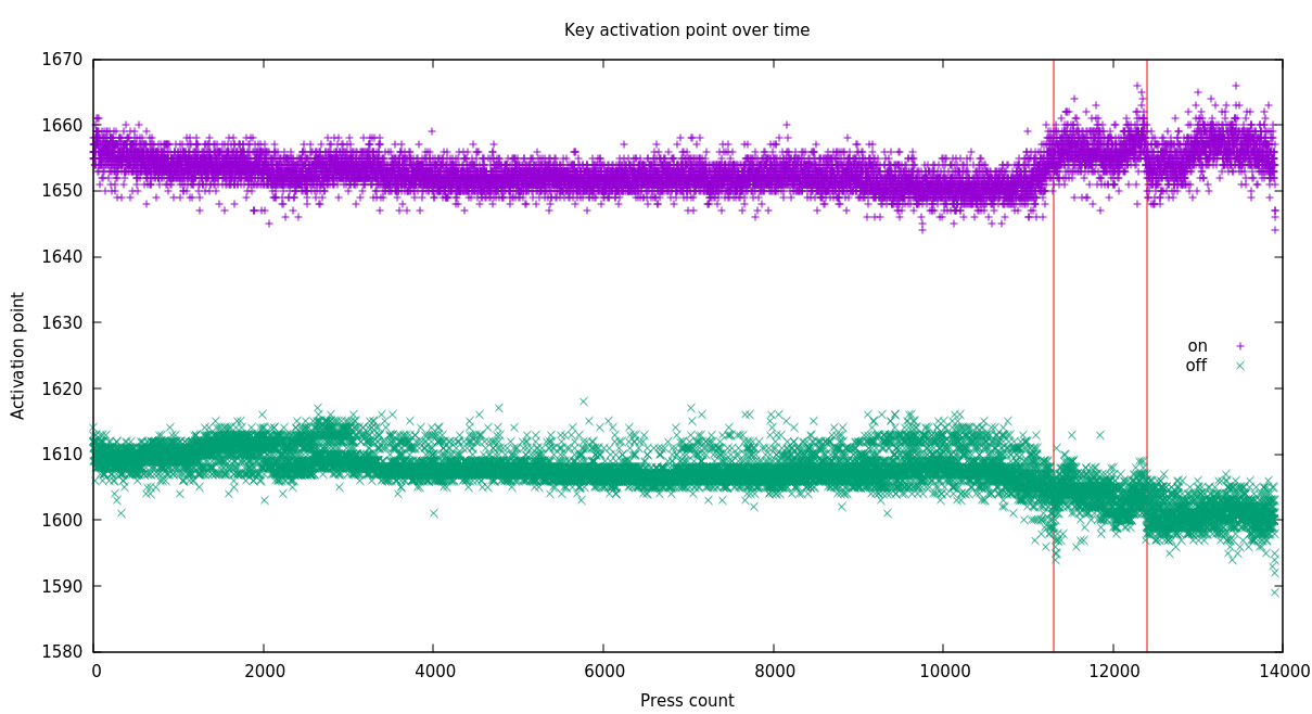 The activation points were relatively consistent for the first ~11300 presses (apart from a surprising bimodal distribution of the release point for part of the test?), until something changed around the position of the first red line, when the servo had to start pressing the finger a bit further before the switch would come on. Then around the second red line at ~12400 presses, the activation position dropped off quite quickly, over the course of only a few tens of presses. I expect both of these points correspond to some part of the spring starting to yield. It might have been interesting to leave a camera filming the tester so that we can see exactly what it looks like at each press.