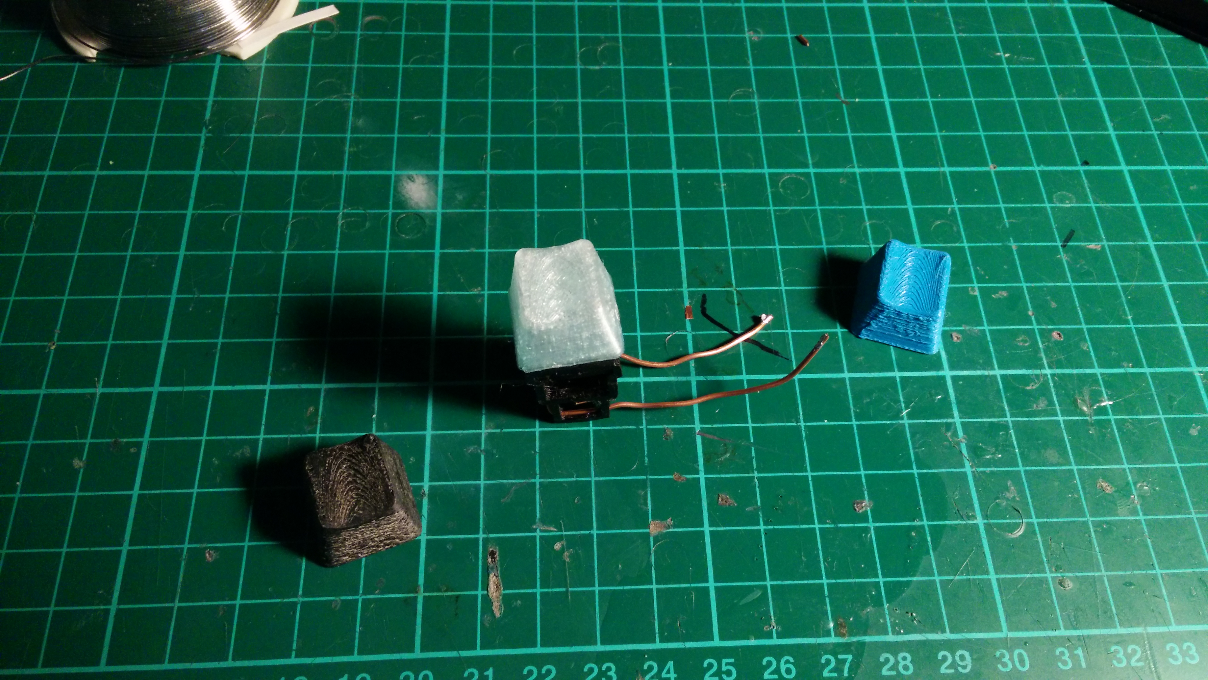 I have started experimenting with putting keycaps on the switches. It's the same model I designed before, but with a rectangular hole instead of a Cherry MX cross.
