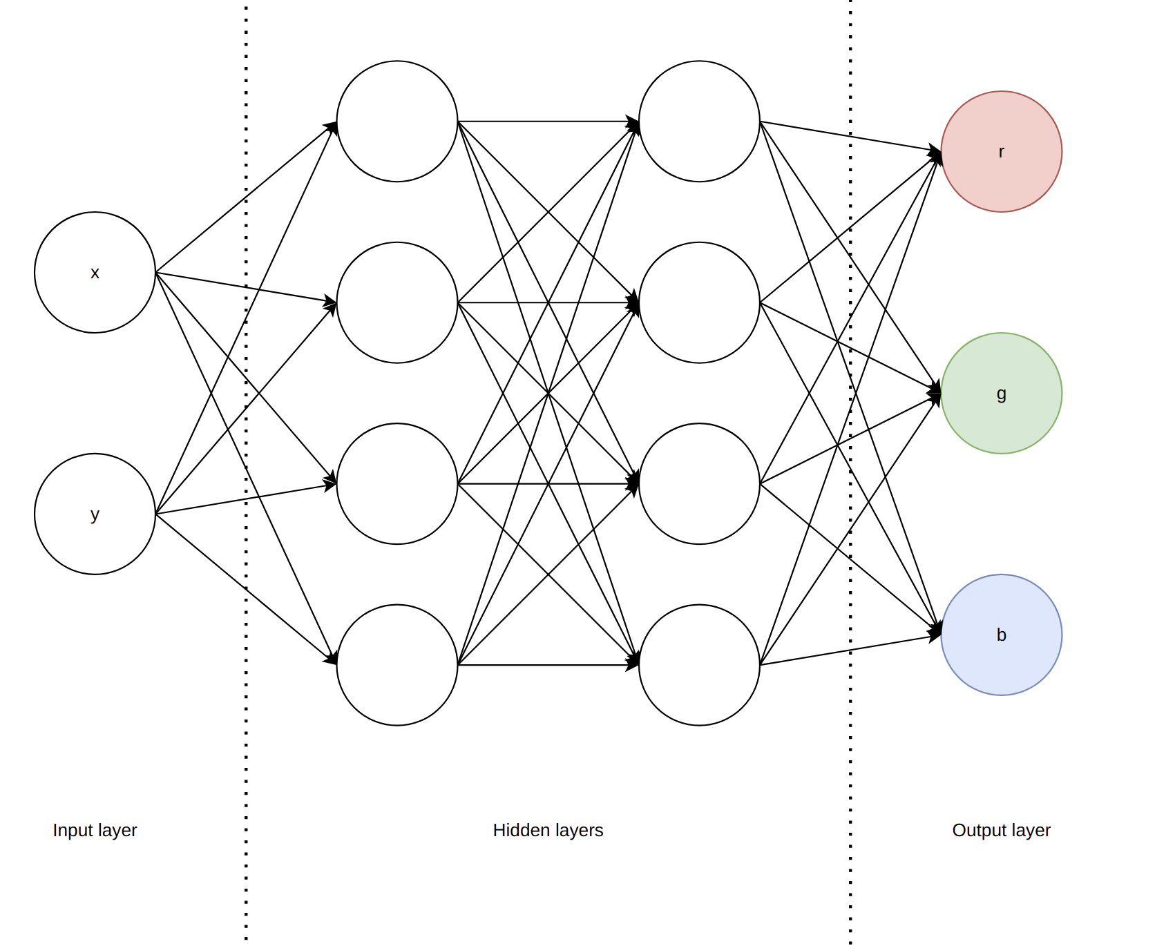 We then create a training set consisting of (x,y) => (r,g,b) for every pixel of the input image, and initialise a neural network with 2 input nodes (x and y), 3 output nodes (r, g, and b), and some number of hidden nodes in some number of hidden layers that we can play with to see what difference it makes. I found I had best results with 3 hidden layers, each with fewer than 20 hidden nodes.