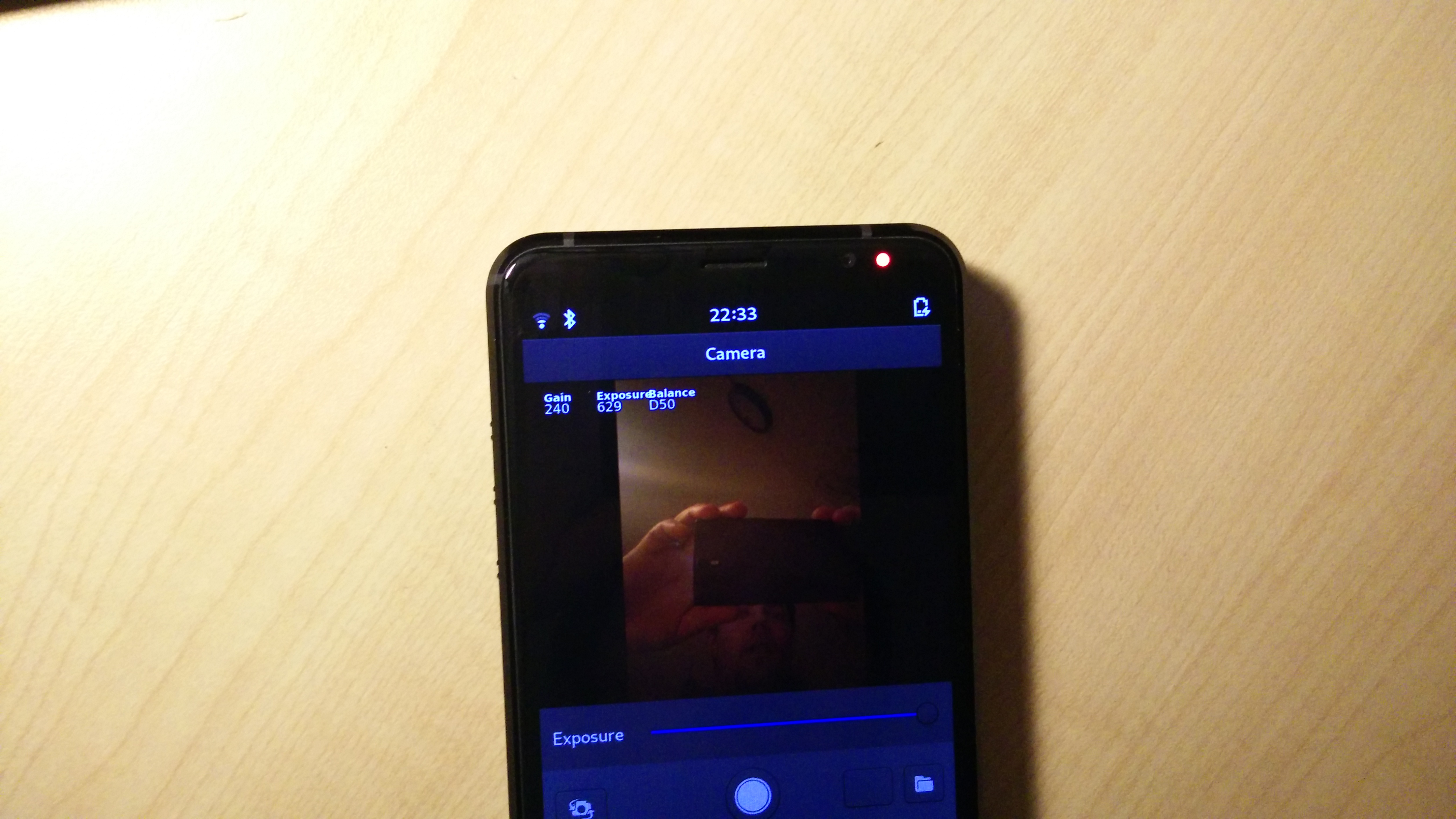The camera is very dark. At first I thought it had some debugging prints overlaid on top of the picture preview, but it turns out this is the camera UI. You click on the number next to "gain", "exposure", "balance", or "focus" (focus only available on the back camera) and you get a slider to adjust the corresponding camera property.