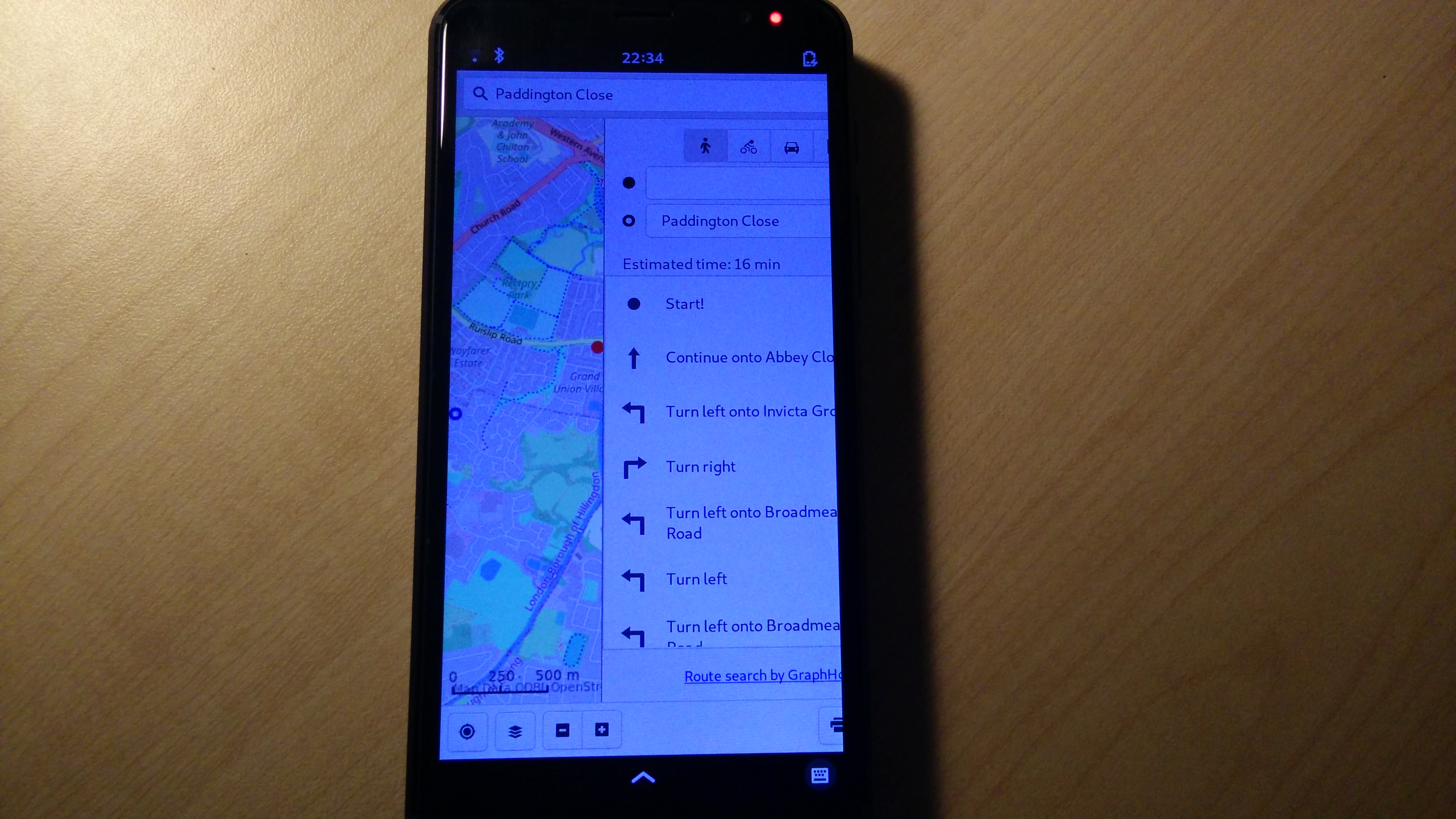 - The maps app has a way for you to search for start and end destinations. The search is really bad, it doesn't recognise postcodes and it thinks all towns are in America. Once you have managed to correctly select a start point and an end point, and you want to start navigation, you can't, because the UI disappears off the right hand edge of the screen so you can't reach the "start navigation" button that presumably exists. If you rotate the screen into landscape mode then it now disappears off the bottom edge of the screen and you still can't reach any buttons.