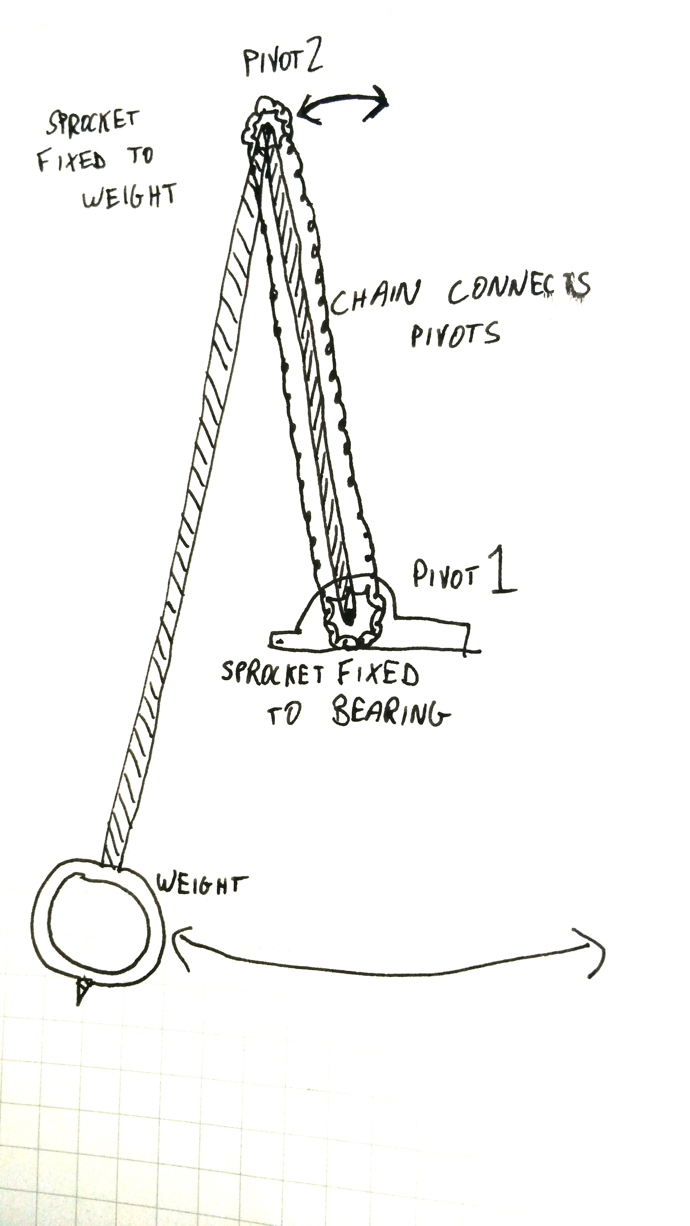 The sprocket at "pivot 1" is fixed to the frame of the apparatus, and the sprocket at "pivot 2" is fixed to the long arm, so that as the long arm rotates, "pivot 2" pulls itself around the chain, which rotates the short arm around "pivot 1" because the sprocket at "pivot 1" can't move.