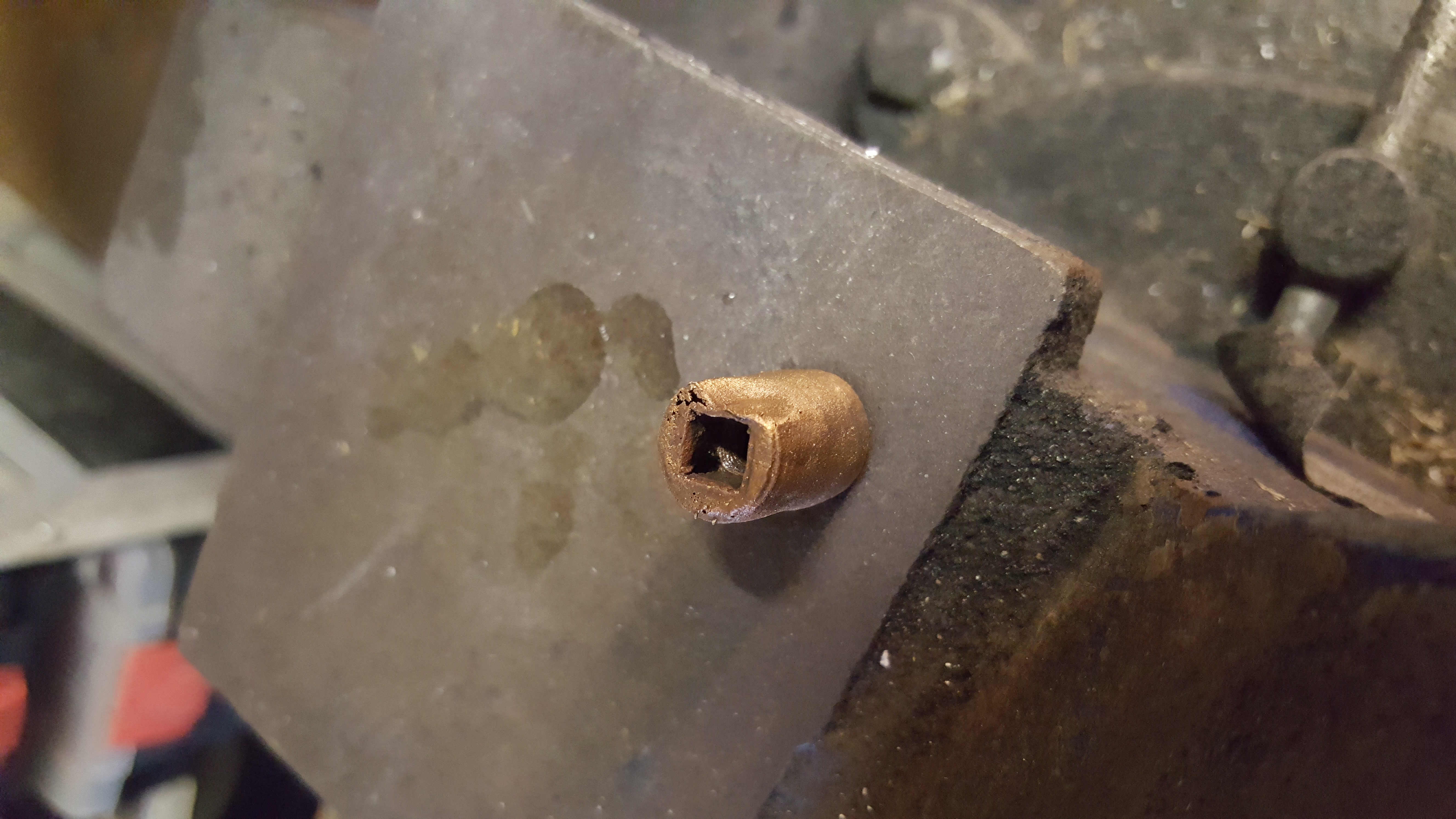 If the part has shrunk by 9% in the X and Y directions, and 6% in the Z direction, then the total volume is reduced to 0.91*0.91*0.94 = 78% of the original volume. But only 40% of the original volume was bronze, so if we want the entire part to be full of bronze and not hollow at the top, then we need to add an entire extra part's worth of extra material at the top, so that when it all sinks to the bottom, there is enough material at the bottom to fill the part solid. Since I already have a handful of 10mm sockets printed in bronze PLA, I might just stick one of those on top to use as sacrificial material.
