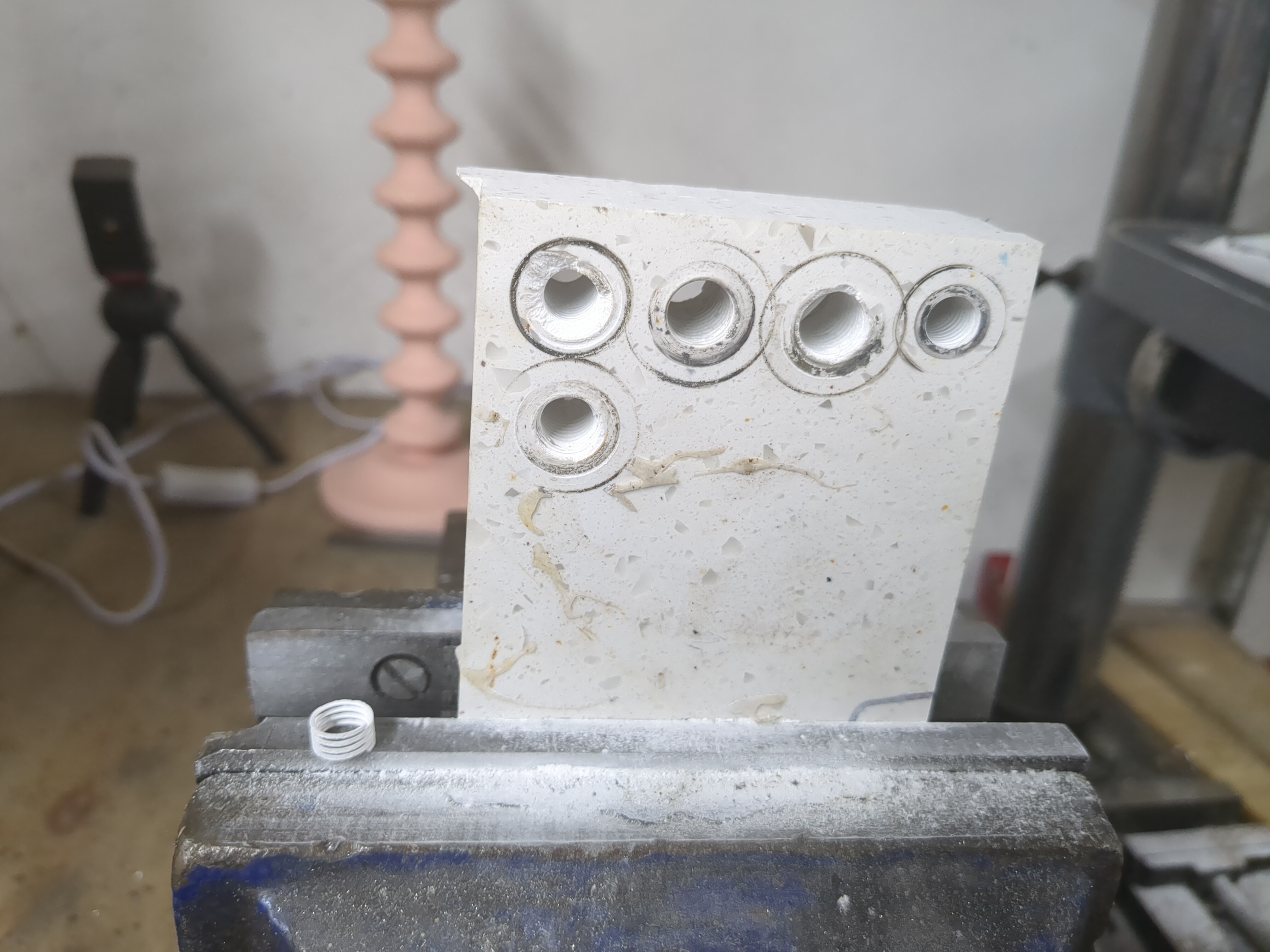 I was hoping to be able to tap threads directly into the composite material and bolt the parts together that way, but I could not find a way to tap convincing threads. They stripped relatively easily with only a medium gronk. I tested things like drilling the hole slightly undersized, using an undersized tap, and a range from M8 to M12 threads. Here are some of my test holes: